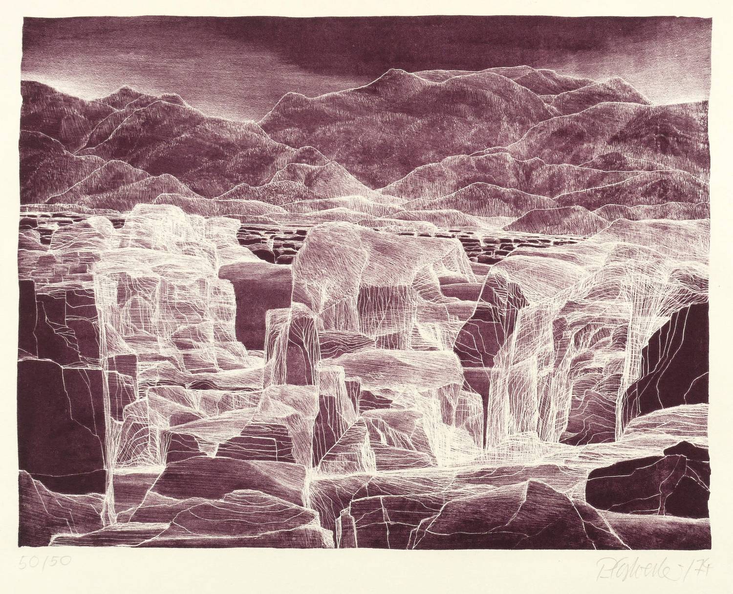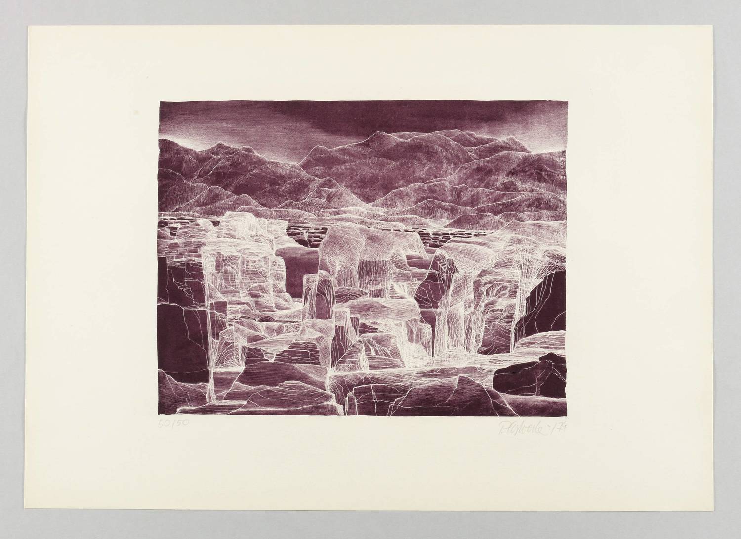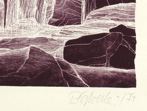 1974. Lithografie / Schablithografie, in Dunkelviolett, auf glattem hellgelbem Karton. – Originale Künstlergrafik, von Peter Sylvester. – Auflage Exemplar Nr. 50/50. – 22,0 x 28,5 cm (Darstellung / Druckbild), 34 x 48 cm (Blatt).