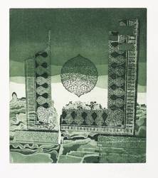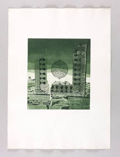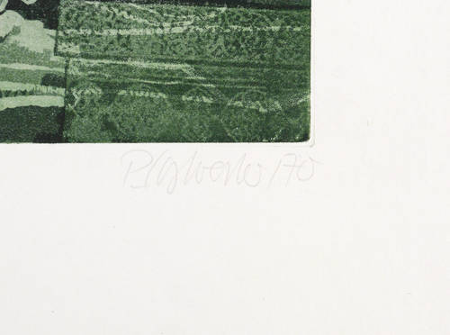 1970. Radierung / Aquatinta, in Dunkelgrün, auf festem hellchamois Velin. – Originale Künstlergrafik, von Peter Sylvester. – Künstlerexemplar (e.a.) Nr. V. – 24,1 x 21,3 cm (Darstellung / Platte), 48 x 35 cm (Blatt).