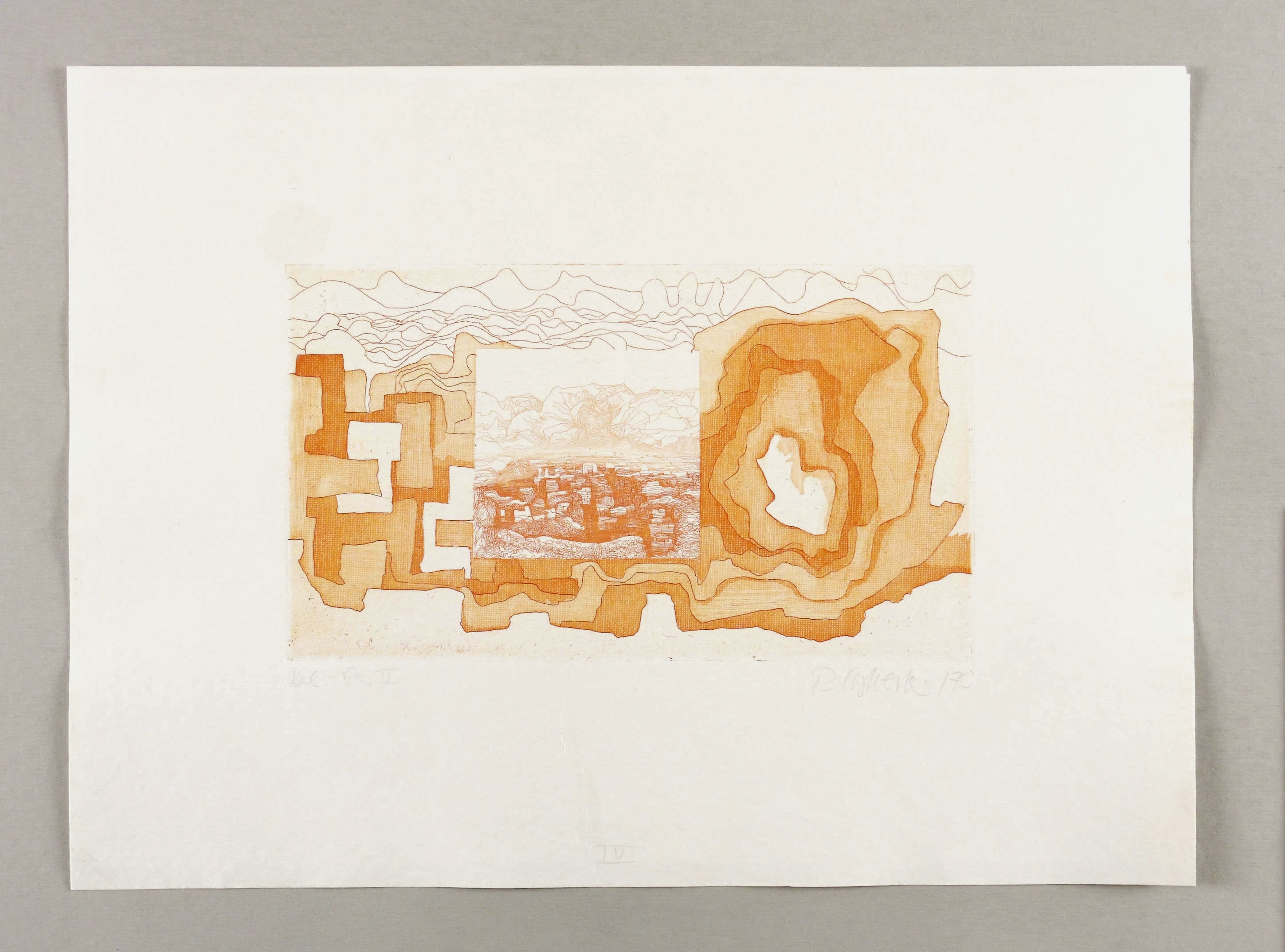 1970. Radierung / Aquatinta, in Orange, auf festem hellchamois Velin. – Originale Künstlergrafik, von Peter Sylvester. – Künstlerexemplar (e.a.) Nr. V. – 16,8 x 28,8 cm (Darstellung / Platte), 48 x 35 cm (Blatt).