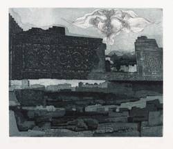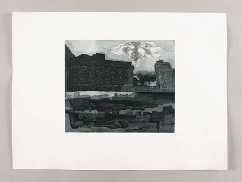 Penndorf 101. – Aus: Peter Sylvester, Mittelasiatische Eindrücke. Sechs farbige Aquatinta-Radierungen (Leipzig: Galerie am Sachsenplatz 1970). – In Bleistift rechts unten signiert und datiert: ″P. Sylvester / 70″. Links Auflagenbezeichnung: ″Bel.-Ex. V″. Unten mittig Blattnummer: ″I″. – Blatt Nr. 1 aus der 6 Blätter umfassenden und in einer Auflage von 25 Exemplaren 1970 von Hans-Peter Schulz herausgegebenen Mappe ″Mittelasiatische Eindrücke″. - Herausragendes Blatt des Künstlers. – Kaum merkliche Quetschfalte und unscheinbare Fleckchen im unteren Rand. Sonst tadellos. Insgesamt guter Zustand.