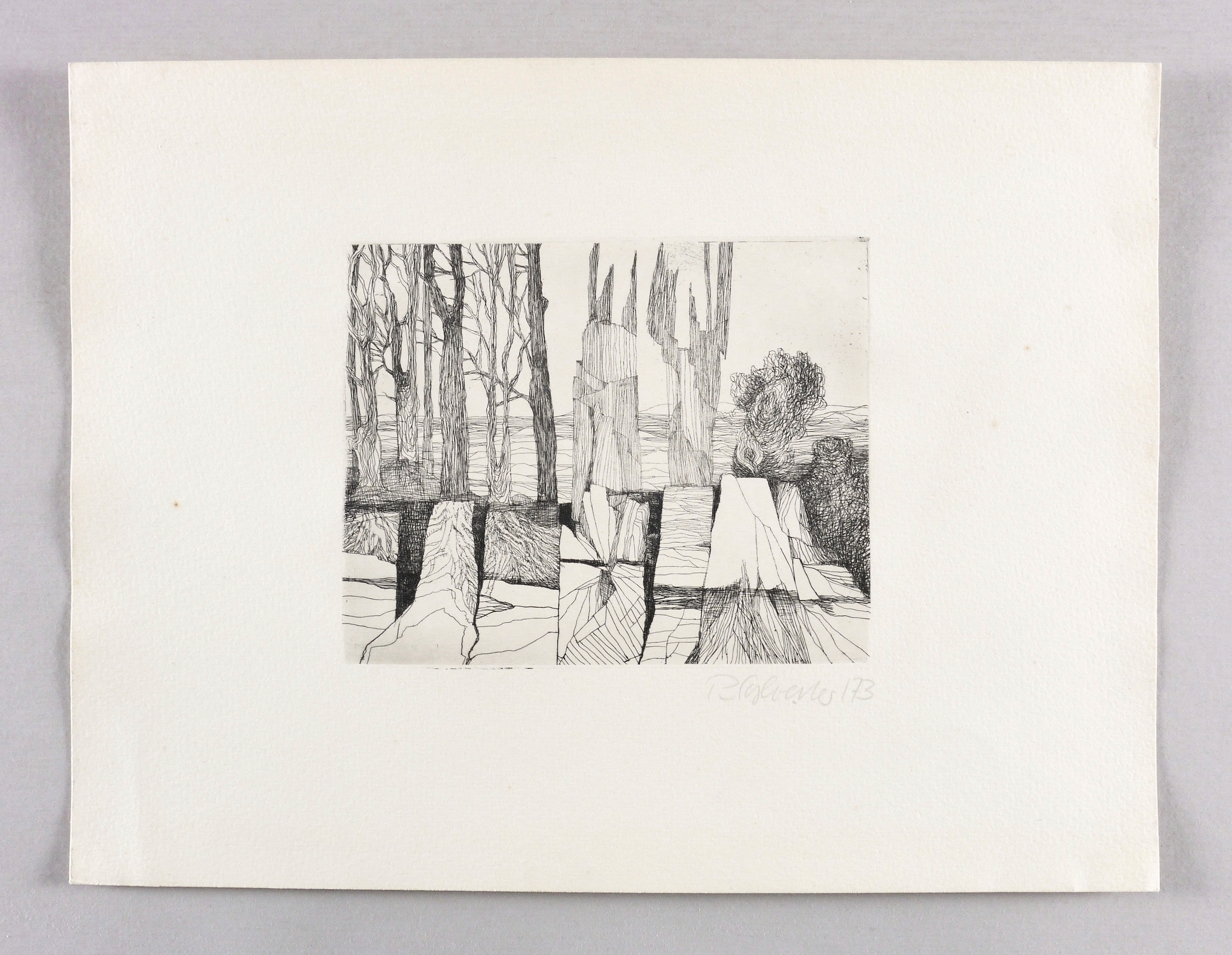 1973. Radierung / Strichätzung, in Schwarz, auf hartem hellchamois Weißenborn. – Originale Künstlergrafik, von Peter Sylvester. – 12,8 x 15,8 cm (Darstellung / Platte), 25 x 33 cm (Blatt).