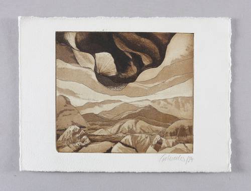 1984. Radierung / Aquatinta & Strichätzung, in Braun, auf kräftigem weißem Velinkarton. – Originale Künstlergrafik, von Peter Sylvester. – 12,4 x 14,1 cm (Darstellung / Platte), 16 x 22 cm (Blatt).