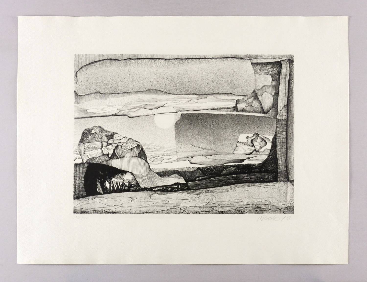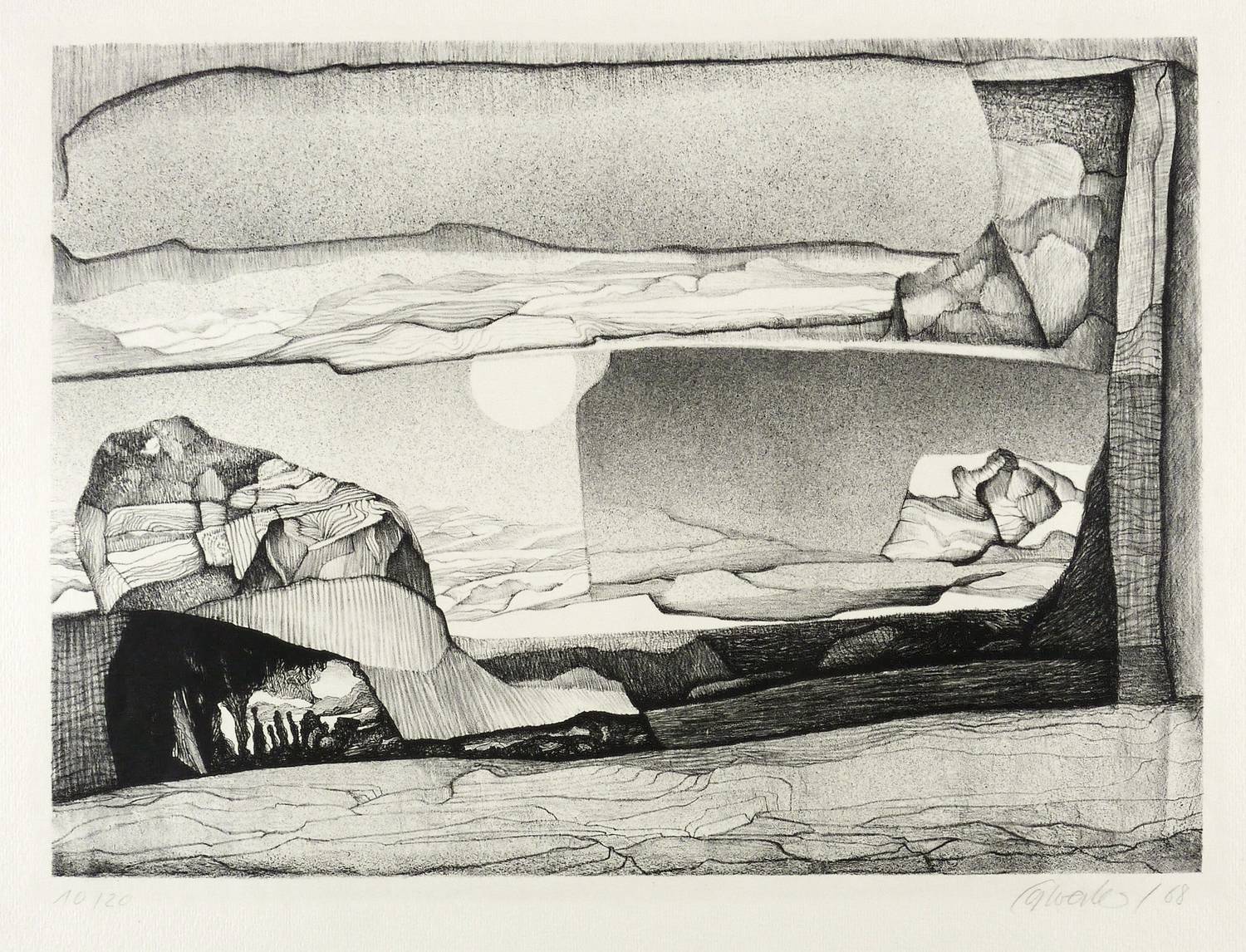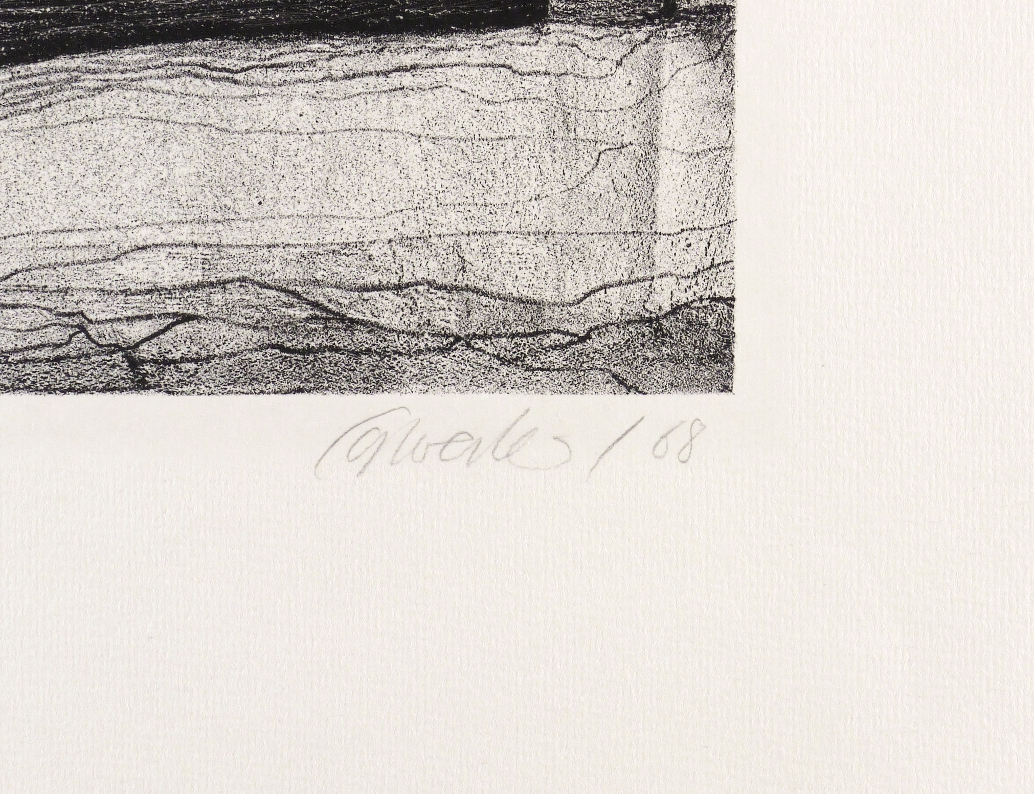 1968. Lithografie / Kreidelithografie, partiell gespritzt, in Schwarz, auf hellchamois Velinkarton. – Originale Künstlergrafik, von Peter Sylvester. – Auflage Exemplar Nr. 10/20. – 51 x 68 cm (Blatt), 32,5 x 44,8 cm (Darstellung / Druckbild).
