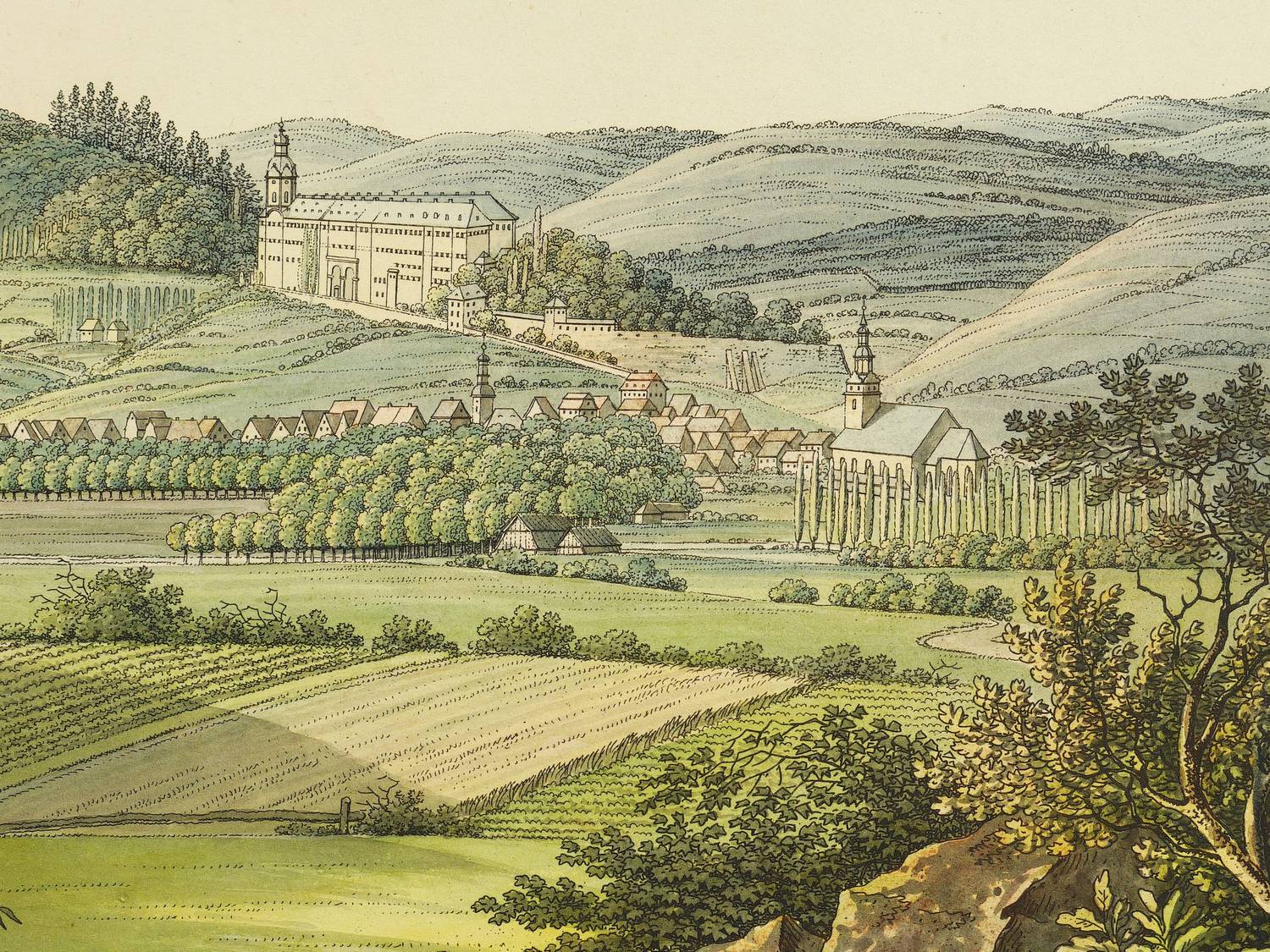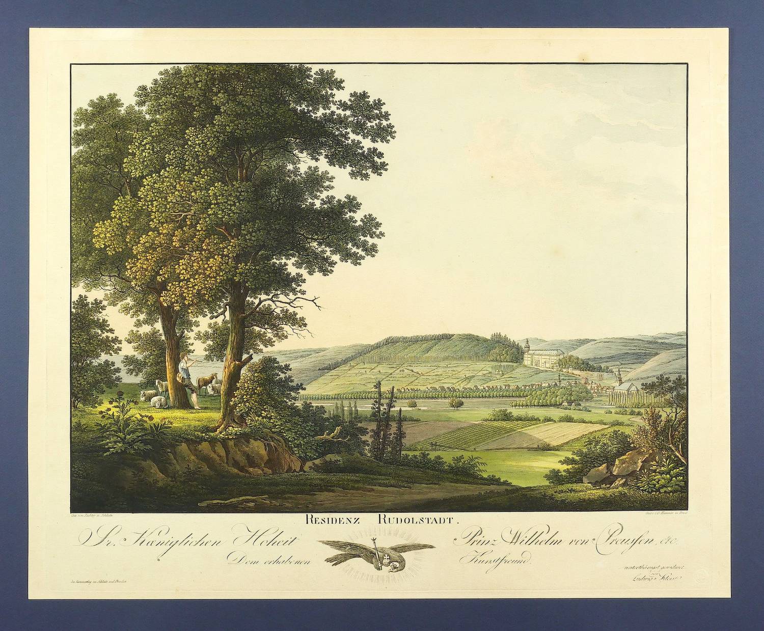 (Schleiz & Dresden: Kleist 1810). – In der Darstellung unten mittig signiert und datiert: ″C.G. Hammer fecit 1810″. Rechts unterhalb der Darstellung signiert ″Gest. v. C. G. Hammer in Dresd.″ Links bezeichnet: ″Gez. von Richter in Schleitz″. Mittig betitelt. Mit einer Widmung des Verlegers Ludwig von Kleist an Wilhelm von Preußen (1783–1851). Verlegeradresse. Mit angeschnittenem Wasserzeichen: ″J WHATMAN″. – Prachtvolle Vedute der Residenz des Fürstentums Schwarzburg-Rudolstadt. – Blatt marginal gebräunt und fleckig. Verso Reste vormaliger Montierung. Sonst von sehr gutem Erhaltungszustand mit wohlerhaltenem Kolorit.