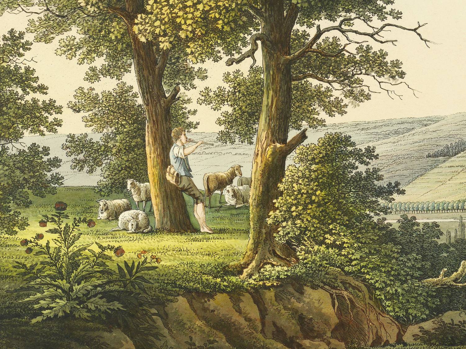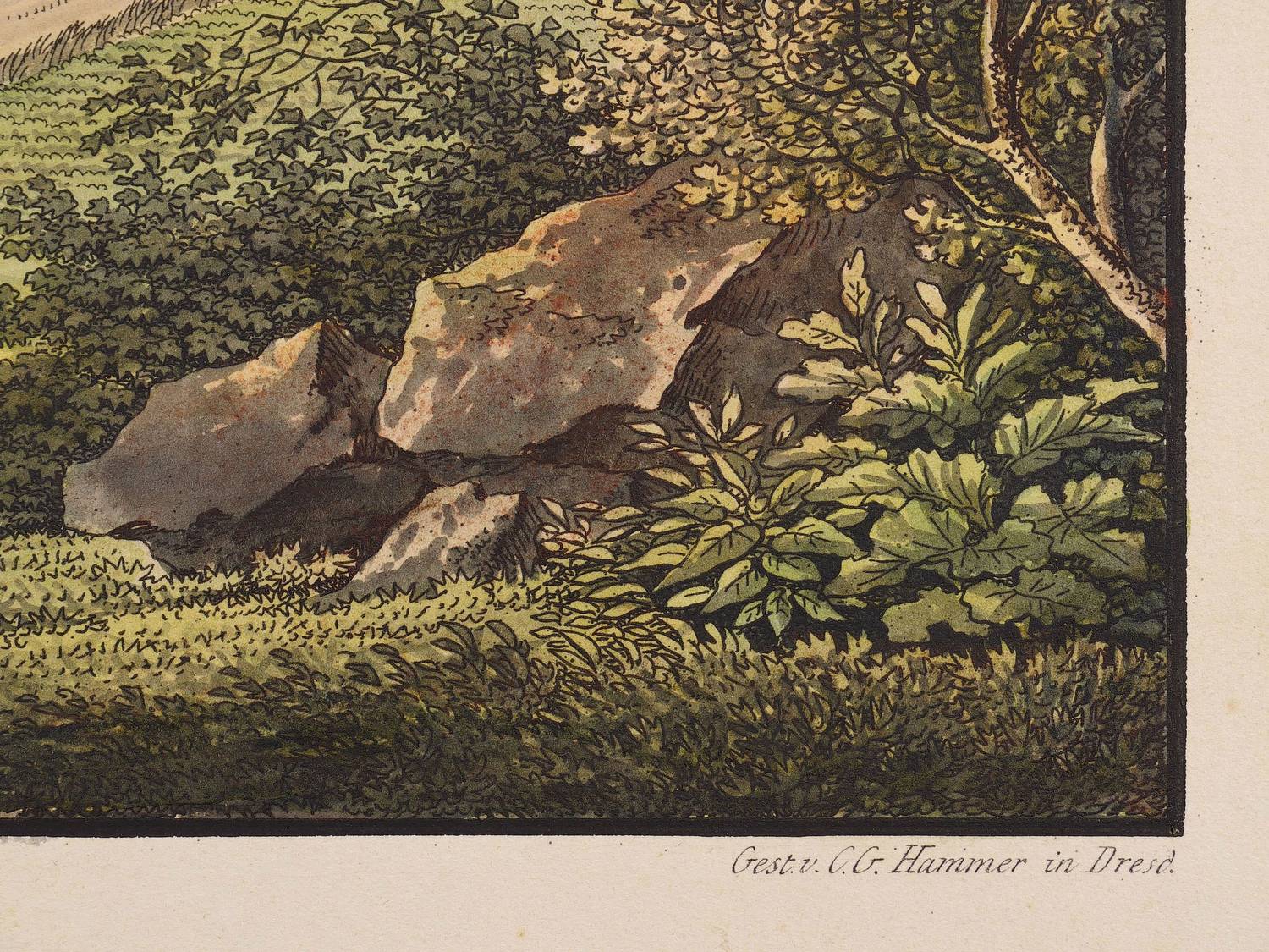 Christian Gottlob Hammer (1779 Dresden - 1864 Dresden). Deutscher Landschaftsmaler und Kupferstecher. Ab 1794 Studium an der Dresdner Akademie, dort 1798 Meisterschüler bei Johann Philipp Veith. 1816 Mitglied der Akademie und dem berühmten Kreis der "Dresdner Romantiker" zugehörig. 1829 Berufung zum außerordentlichen Professor. Im Wesentlichen konzentrierte sich Hammer auf Landschaftsdarstellungen und Städtebilder. Sein umfangreiches Gesamtwerk umfasst Arbeiten in den verschiedenen Techniken, u.a. Zeichnungen in Sepia und Wasserfarben sowie Radierungen und Kupferstiche nach eigenen Entwürfen und Vorlagen anderer Künstler, u.a. Johann Clausen Dahl, Caspar David Friedrich, Ernst Ferdinand Oehme.