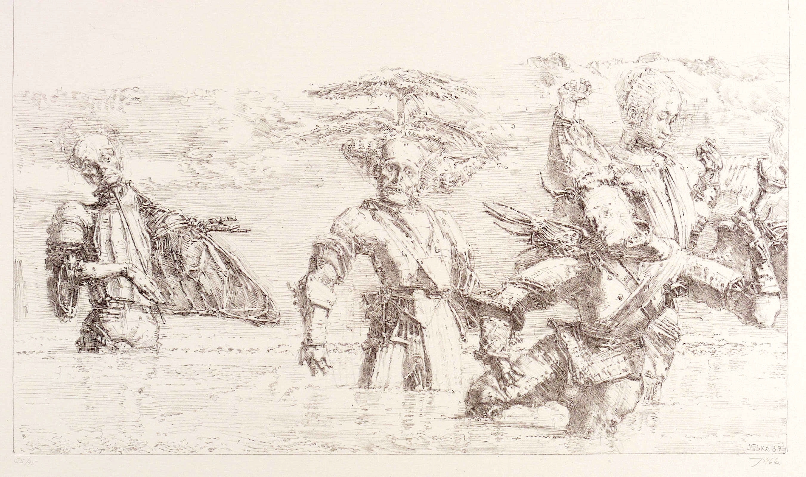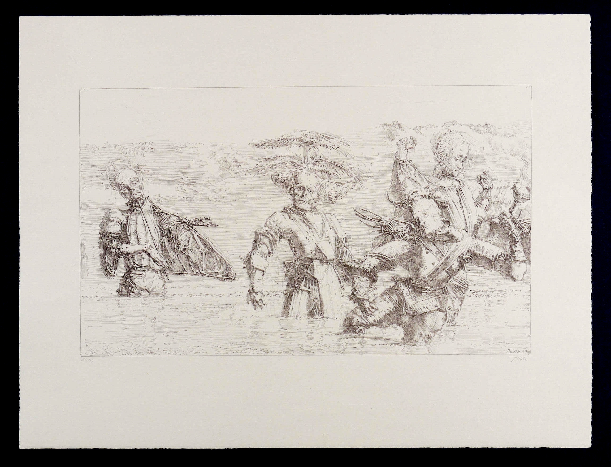 1989. Lithografie / Kreidelithografie, in Schwarz, auf hellem Zerkall-Bütten. – Originale Künstlergrafik, von Werner Tübke. – Auflage Exemplar Nr. 55/75. – 24,8 x 41,6 cm (Darstellung), 40 x 53 cm (Blatt).