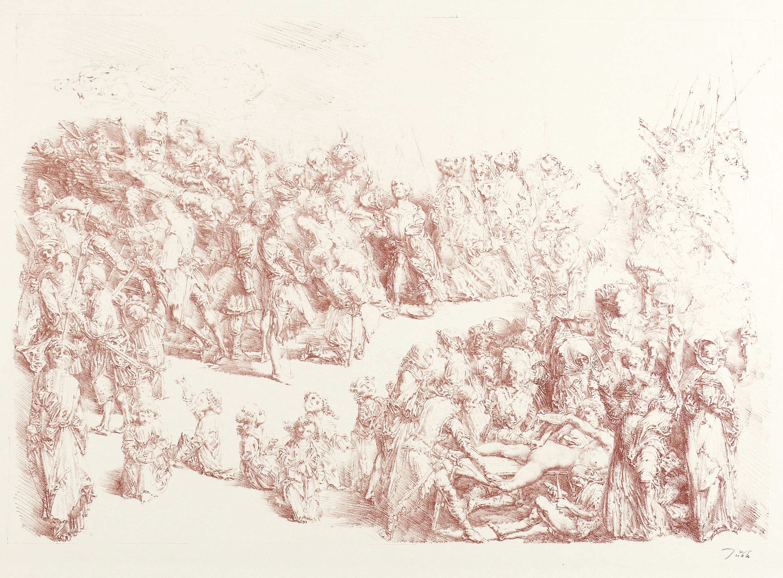 Tübke-Schellenberger 101. – Rechts unten in Bleistift signiert. – Dieses Blatt steht unmittelbar im Zusammenhang mit Tübkes Arbeiten am Monumentalgemälde ″Frühbürgerliche Revolution in Deutschland″, das 1976-87 für das Panorama-Museum in Bad Frankenhausen entstand. - Seltene Farbvariante zu den bekannten Auflagendrucken in Schwarz. – Tadellos. Sehr guter Zustand.