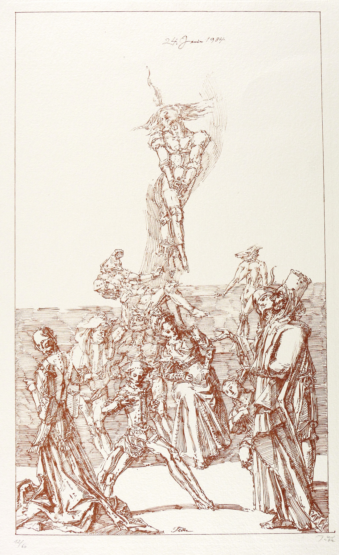 1984. Zinkografie / Federlithografie, in Sepia, auf hellem Hahnemühle-Bütten. – Originale Künstlergrafik, von Werner Tübke. – Auflage Exemplar Nr. 12/60. – 45,2 x 26,8 cm (Darstellung / Einfassungslinie), 54 x 35 cm (Blatt).