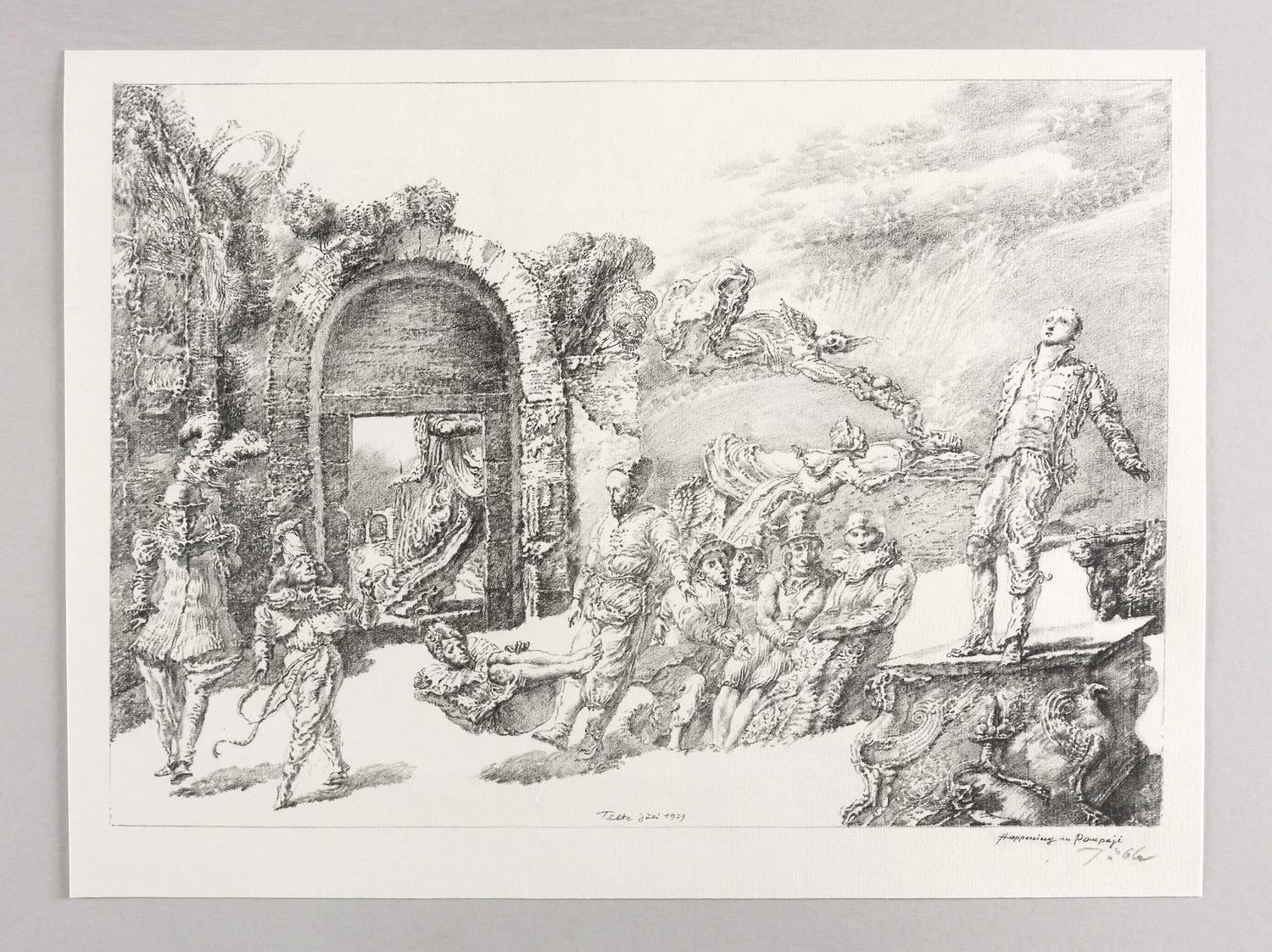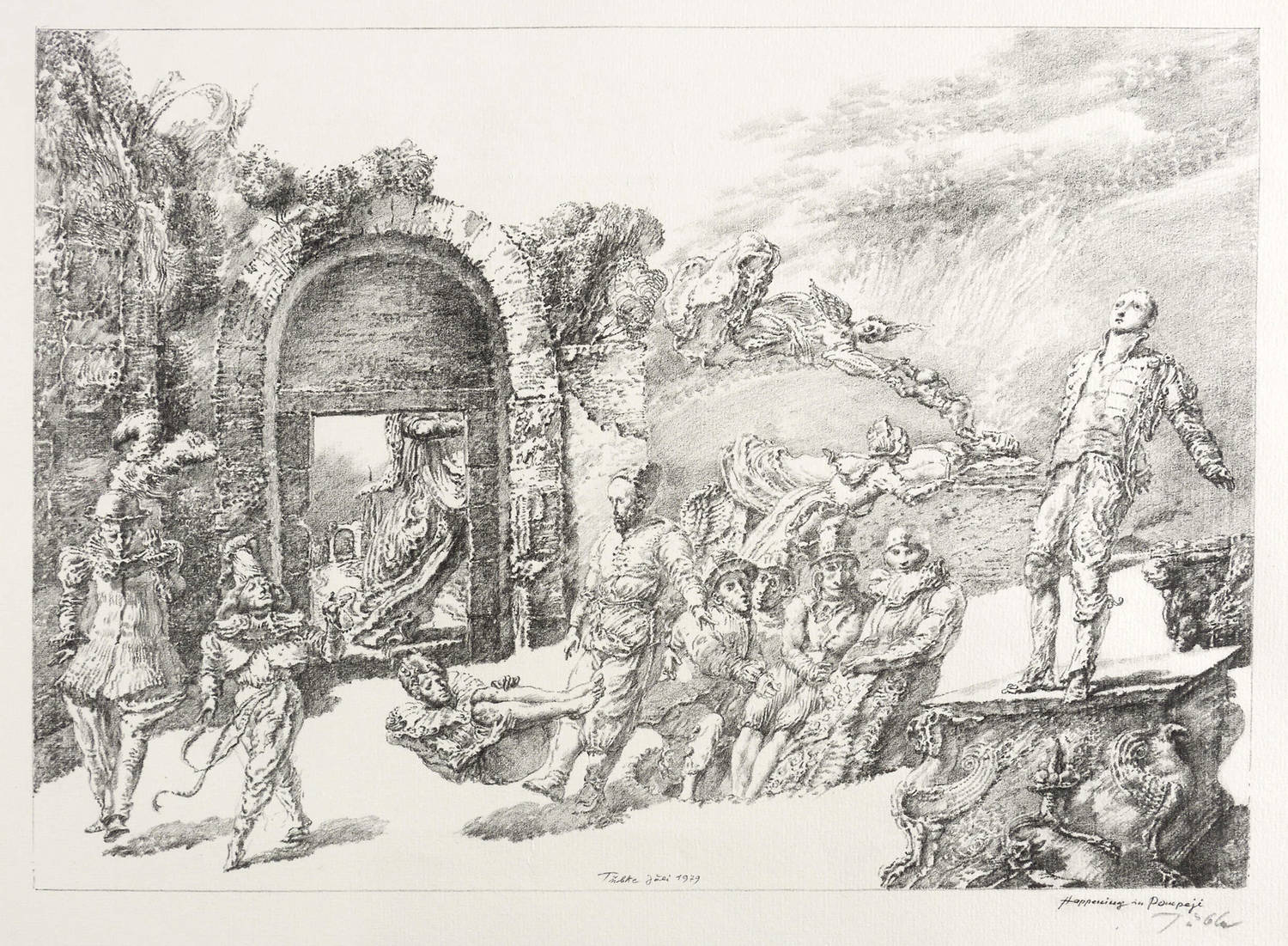 Tübke-Schellenberger 71. WVZ L 9/79. – Rechts unten in Bleistift signiert: ″Tübke″. In der Platte unten mittig nochmals signiert und datiert: ″Tübke Juli 1979″. Rechts unten bezeichnet: ″Happening in Pompeji″. – Druck von Gerhardt Günther in der Hochschuldruckerei der Burg Giebichenstein Halle. – Tadelloses Exemplar. Sehr guter Zustand.