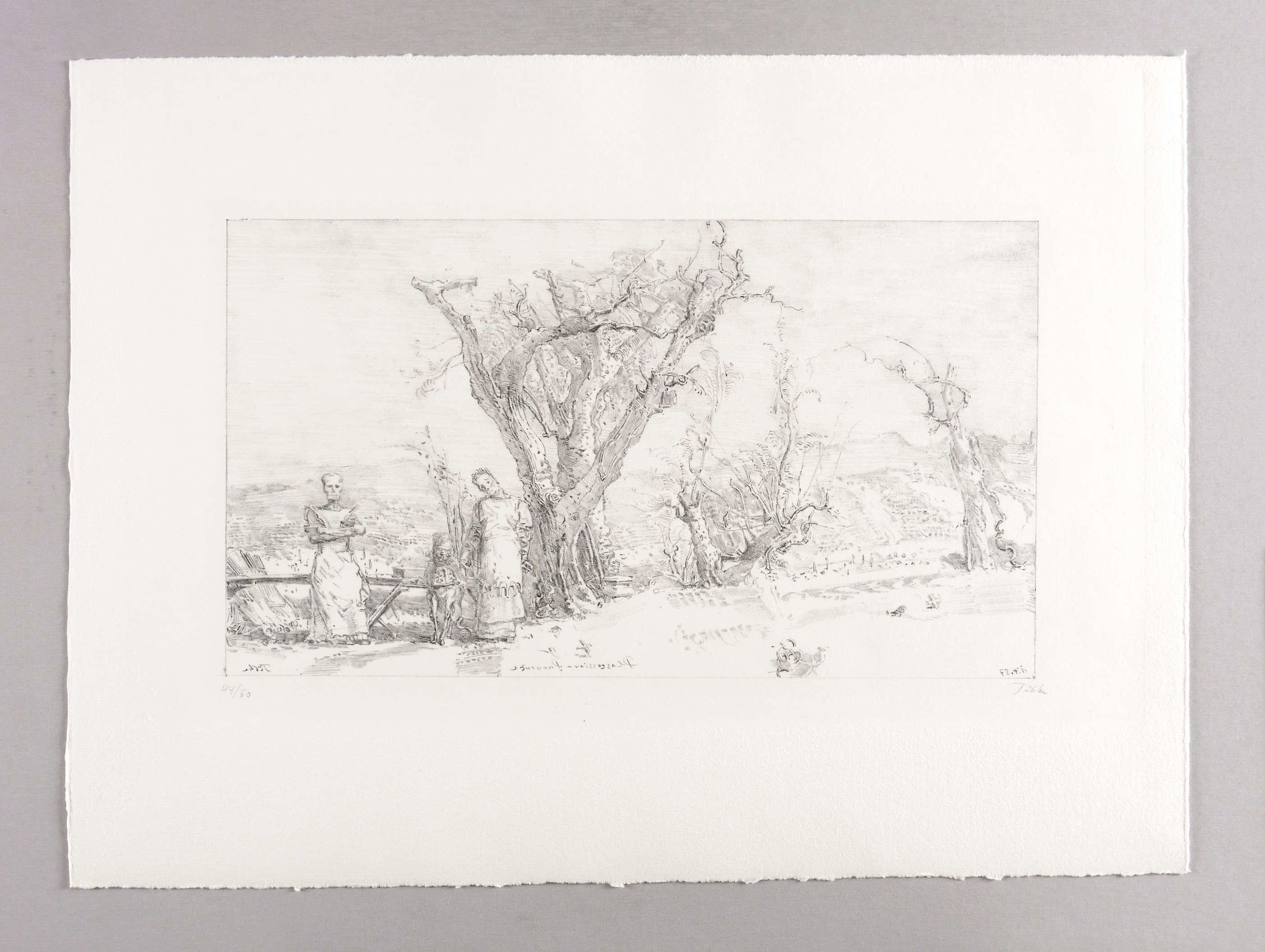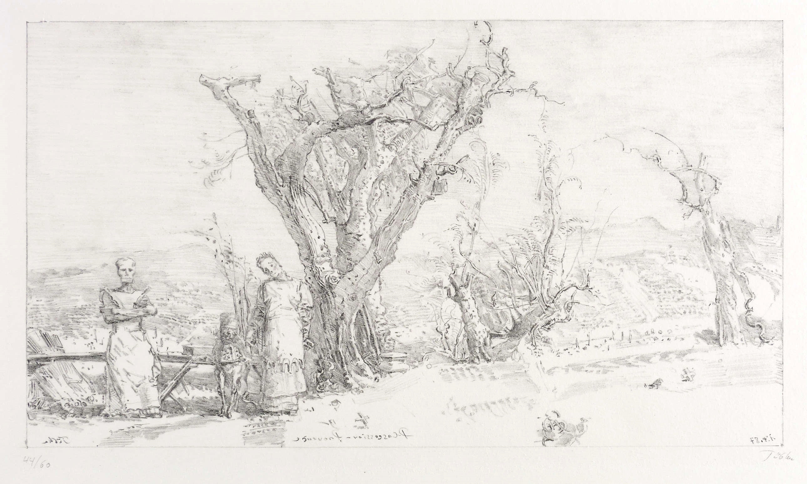 1987. Lithografie / Kreidelithografie, in Schwarz, auf schwerem hellchamois Hahnemühle-Bütten. – Originale Künstlergrafik, von Werner Tübke. – Auflage Exemplar Nr. 44/60. – 21,8 x 38,7 cm (Darstellung / Druckbild), 31,0 x 48,5 cm (Stein), 40 x 54 cm (Blatt).