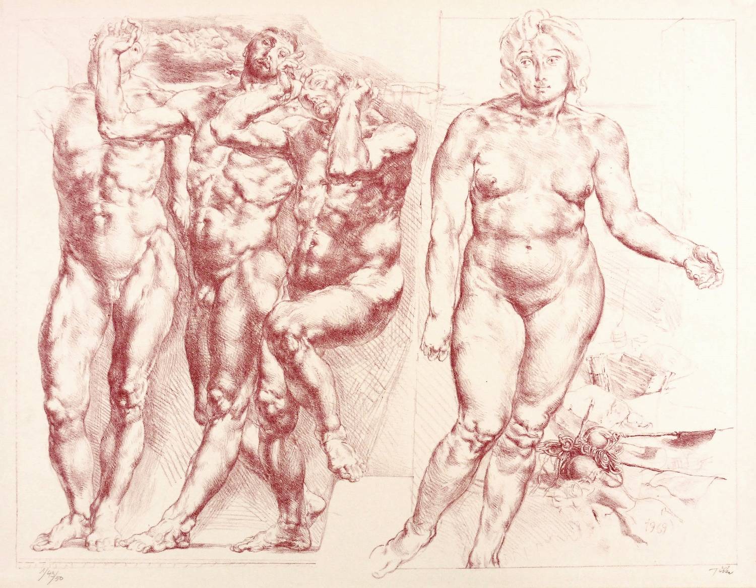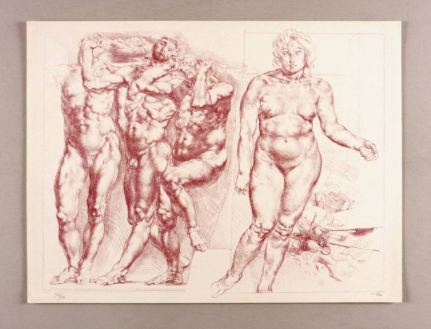 1969. Lithografie / Kreidelithografie, in Rötelton, auf festem hellgelbem Velinkarton. – Originale Künstlergrafik, von Werner Tübke. – Auflage Exemplar Nr. 43/50. – 34,2 x 43,6 cm (Darstellung), 36 x 48 cm (Blatt).