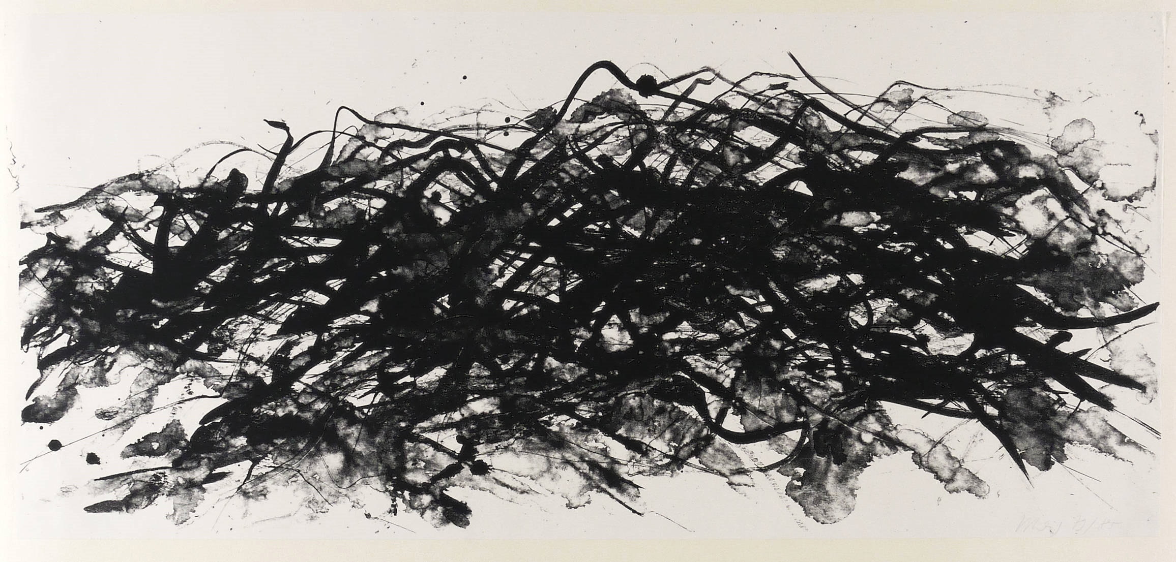 1979/1980. Lithografie / Pinsellithografie, in Schwarz, auf gewalztem China, auf chamois Hahnemühle. – Originale Künstlergrafik, von Max Uhlig. – Künstlerexemplar (e.a.). – 40,5 x 94,9 cm (Darstellung / Stein), 59 x 100 cm (Blatt).