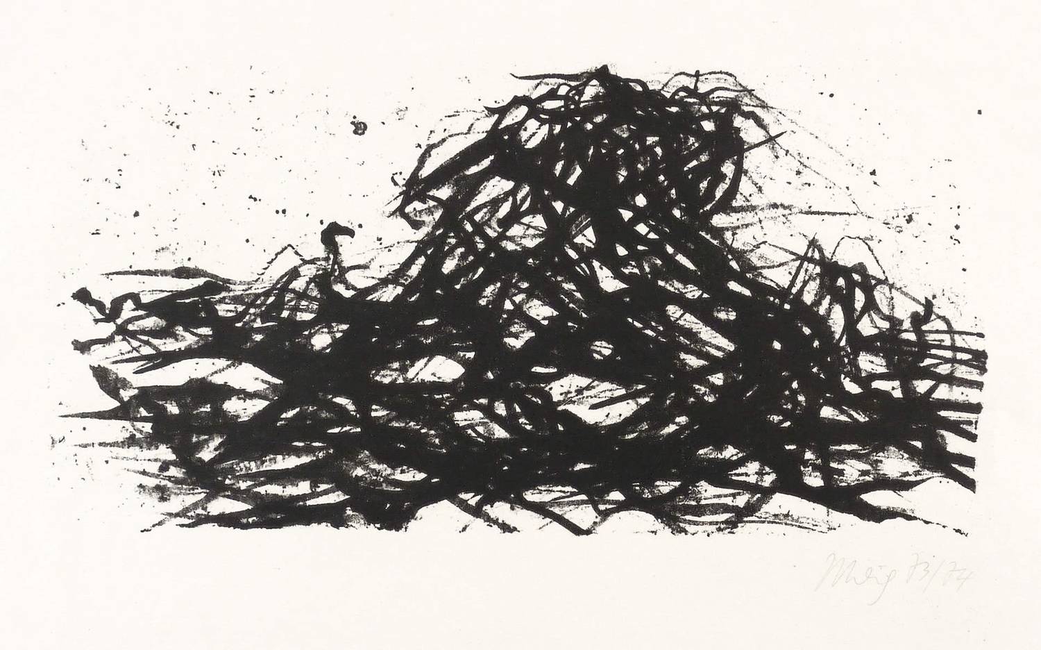 1973/1974. Lithografie / Pinsellithografie, in Schwarz, auf hartem hellchamois Maschinenbütten. – Originale Künstlergrafik, von Max Uhlig. – 13,7 x 26,8 cm (Darstellung / Druckbild), 38 x 51 cm (Blatt), 22,5 x 31,5 cm (Stein).