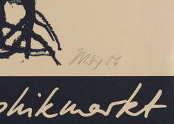 Oesinghaus 331. – Rechts unten in Bleistift signiert und datiert: ″Uhlig 06″. Links Auflagenbezeichnung. Rechts unten Prägestempel der Dresdner Grafikwerkstatt. – Originalgrafisches limitiertes Plakat zum 25. Dresdner Graphikmarkt in Dresden. - Ein Exemplar im Kupferstichkabinett Dresden, Staatliche Kunstsammlungen (Inv.-Nr. A 2007- 84). – Leichte Lagerspuren in den Blattkanten. Mäßig guter Zustand.