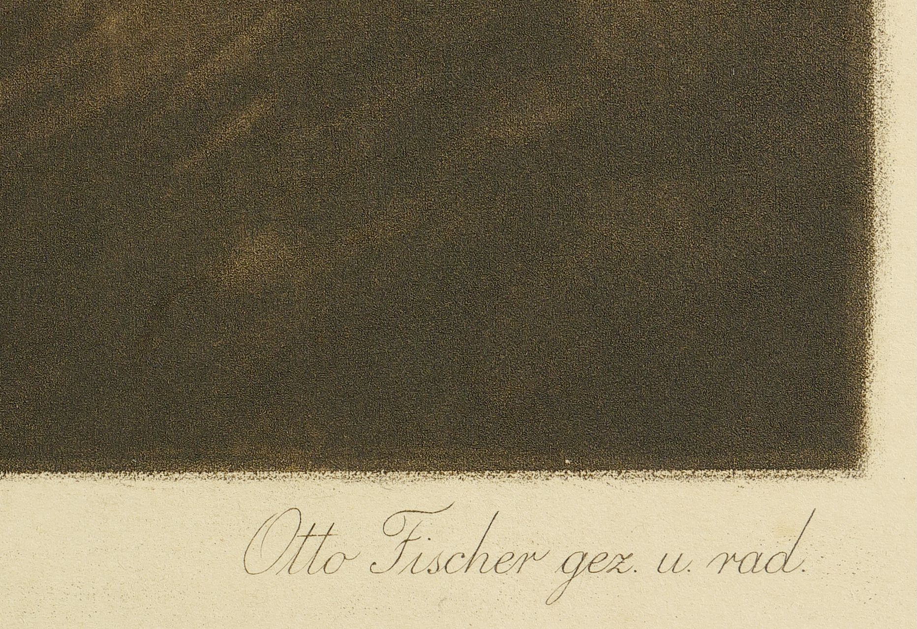 In der Platte rechts unten signiert ″Otto Fischer gez. u. rad.″ Links Verlegeradresse Giesecke & Devrient, Leipzig. – Großartiges arkadisch anmutendes Blatt, in dem sich Jugendstil und Symbolismus stilistisch berühren. - Hauptblatt des Künstlers. – Papier gebräunt und etwas knickspurig. Blattrand etwas angeschmutzt, stockfleckig und mit einigen hinterlegten Rissen. Insgesamt mäßig guter Zustand.