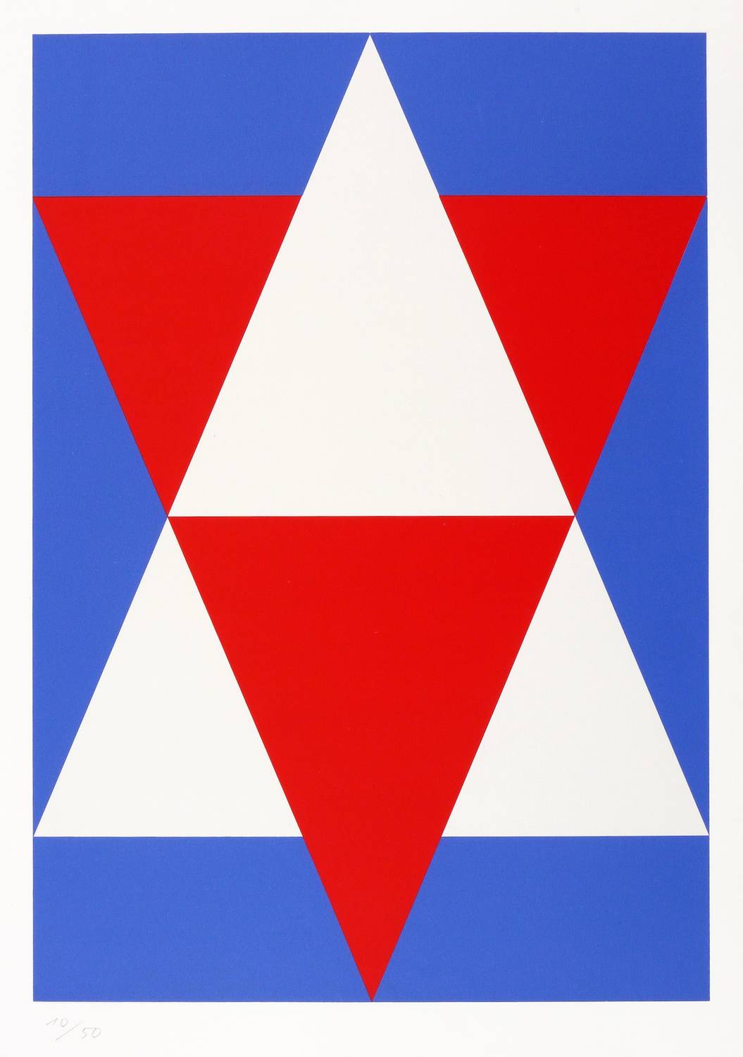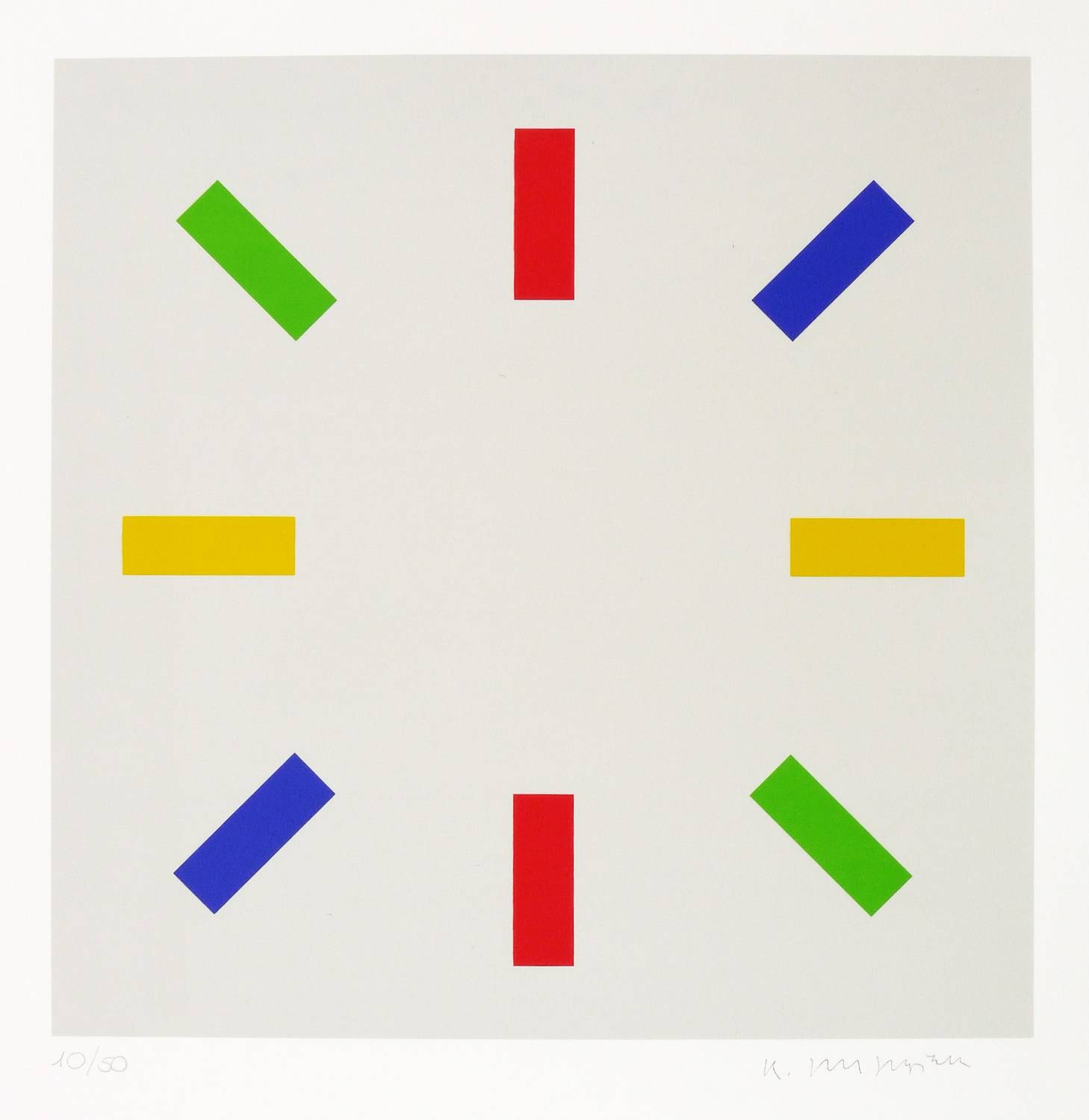 Zille S 44 c (von c). – Aus: Hermann Glöckner, Anton Stankowski & Karl Duschek, Sterne. Stars (Stuttgart: Galerie Beatrix Wilhelm 1994). – Zwei Blätter rechts unten in Bleistift signiert, ein Blatt verso mit dem Stempel des Hermann Glöckner Archiv. Alle links unten mit handschriftlicher Auflagenbezeichnung: ″10/50″. – Vollständiges originalgrafisches Mappenwerk inklusive 1 Textblatt mit Vorwort von Gunther Thiem, 1 Innen-Umschlag und 3 jeweils in Passepartout liegende Farbsiebdrucke. - Mit der in Rot und Blau gedruckten und ins Hochformat gestellten Arbeit ″Druchdringung″ von Hermann Glöckner. – Komplett mit anthrazitfarbenem Pappschuber. Alle Blätter tadellos erhalten. Insgesamt sehr guter Zustand.