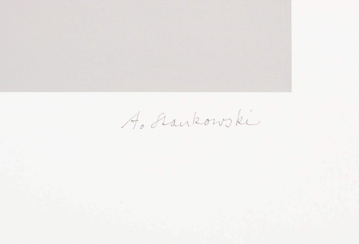 Anton Stankowski (1906 Gelsenkirchen - 1998 Esslingen). Deutscher Maler, Grafiker und Fotograf. Namhafter Vertreter der konstruktiv-konkreten Kunst in Westdeutschland. Lehre als Dekorations- und Kirchenmaler. Ab 1927 Studium Grafik, Typografie und Fotografie an der Folkwangschule in Essen bei Max Burchartz. Noch während des Studiums erste sogenannte "Funktionelle Grafik". Ab 1929 Anstellung im Reklameatelier von Max Dalang. In diesen Jahren Konzepte der "konstruktiven Grafik" und der "Gestaltungslehre". 1934 Entzug der Aufenthaltsgenehmigung, Umzug nach Lörrach. Ab 1938 freier Grafiker in Stuttgart. 1940-48 Soldat und Kriegsgefangener in Russland. Danach Schriftleiter, Grafiker und Fotograf der "Stuttgarter Illustrierten". Im Stuttgarter Künstlerkreis um Willi Baumeister, Max Bense, und Egon Eiermann etabliert. 1964 Teilnahme an der documenta III. 1964 Gastdozent der Hochschule für Gestaltung Ulm. 1969-72 Vorsitzender des Ausschusses für Visuelle Gestaltung der Olympischen Spiele München. 1973 Entwurf für das Logo der Deutschen Bank, daneben zahlreiche weitere bekannte Marken und Logos, wie die der Münchener Rückversicherungs-Gesellschaft oder von Rewe. 1972-2012 Grafisches Atelier Stankowski und Partner (ab 1981 Stankowski+Duschek). In den 1970er Jahren verstärkte Hinwendung zur Malerei. 1983 Mitbegründer der "Künstlervereinigung Konstruktive Tendenzen". 1976 Professur des Landes Baden-Württemberg. 1991 Hans-Molfenter-Preis der Stadt Stuttgart, 1998 Harry-Graf-Kessler-Preis (Ehrenpreis des Deutschen Künstlerbundes).