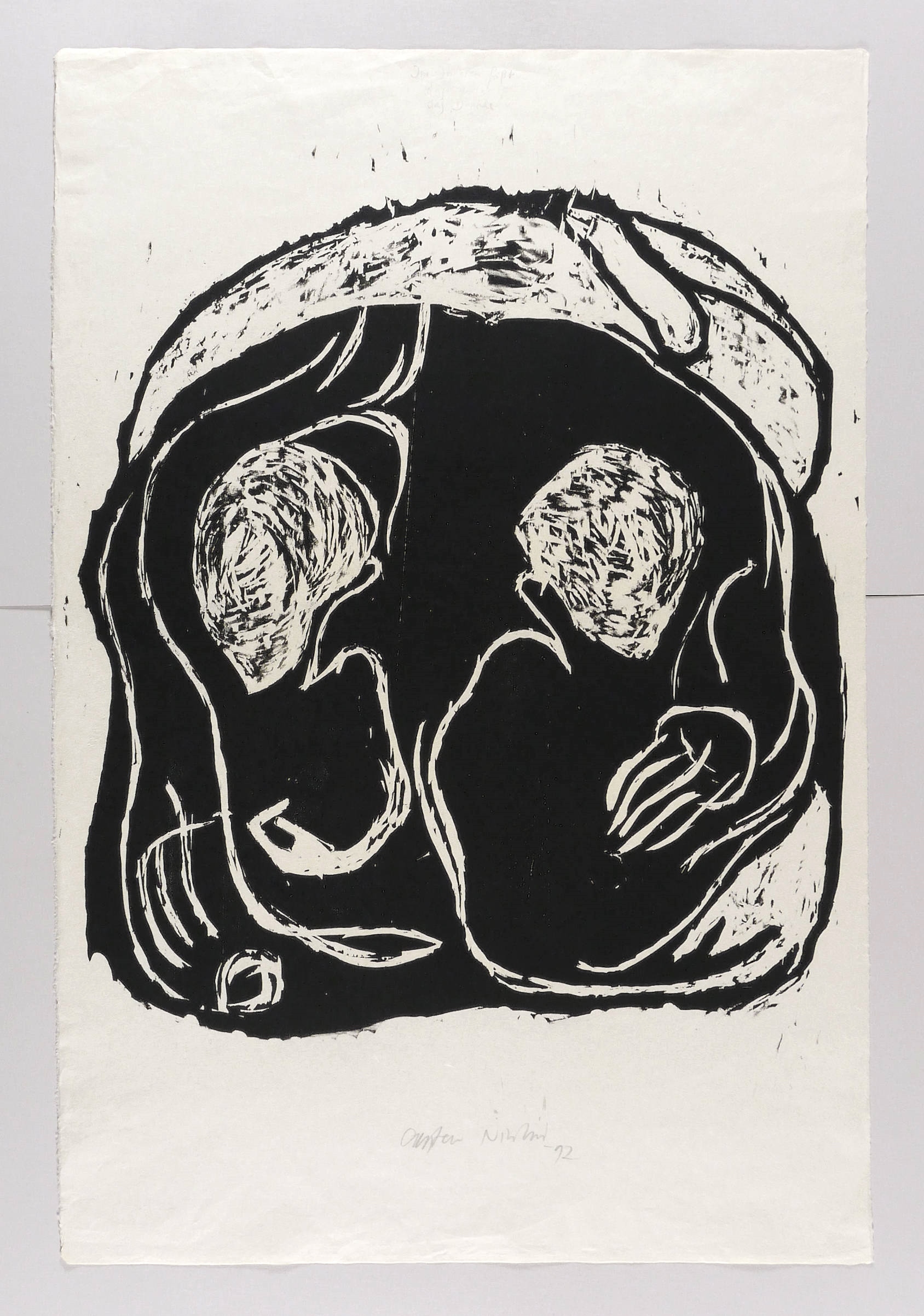1992. Holzschnitt, in Schwarz, auf gelblichem Japanbütten. – Originale Künstlergrafik, von Carsten Nicolai. – 73,3 x 62,6 cm (Darstellung / Druckbild), 98 x 65 cm (Blatt).