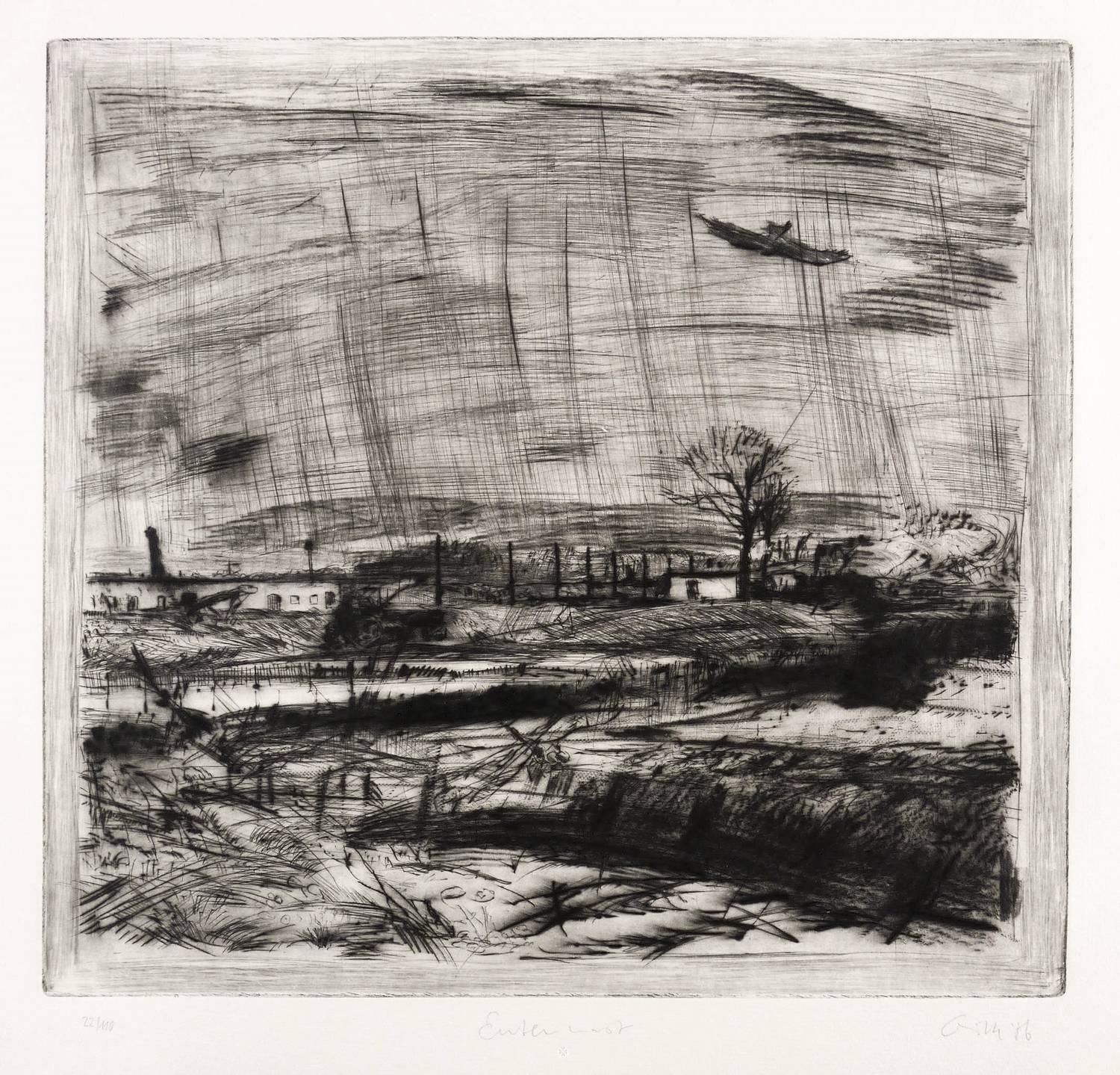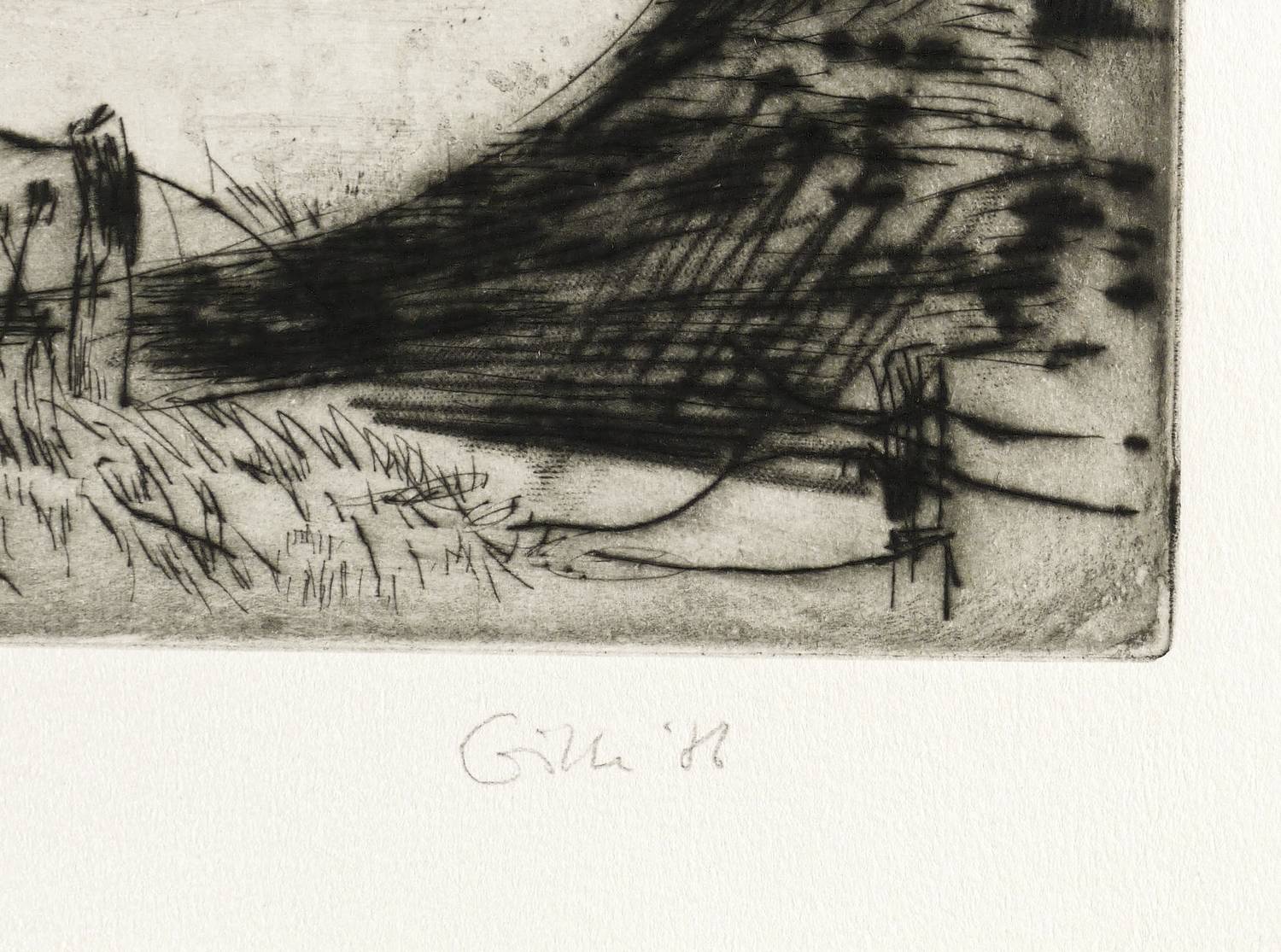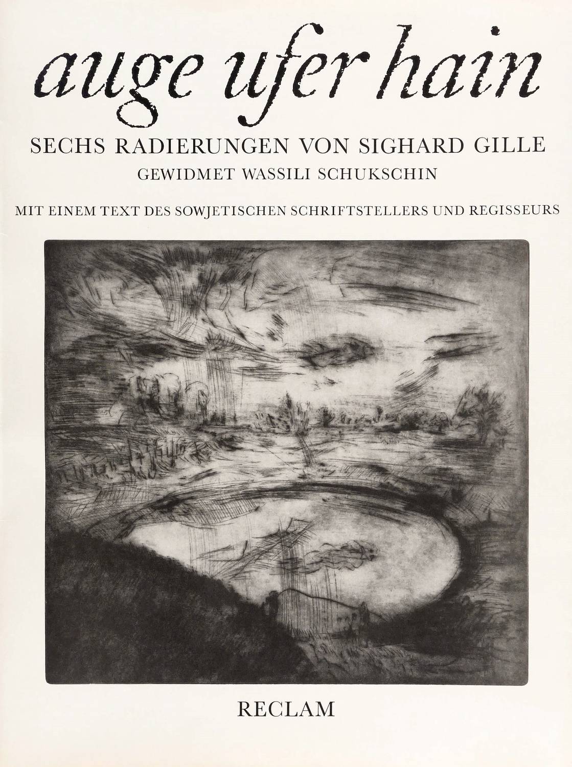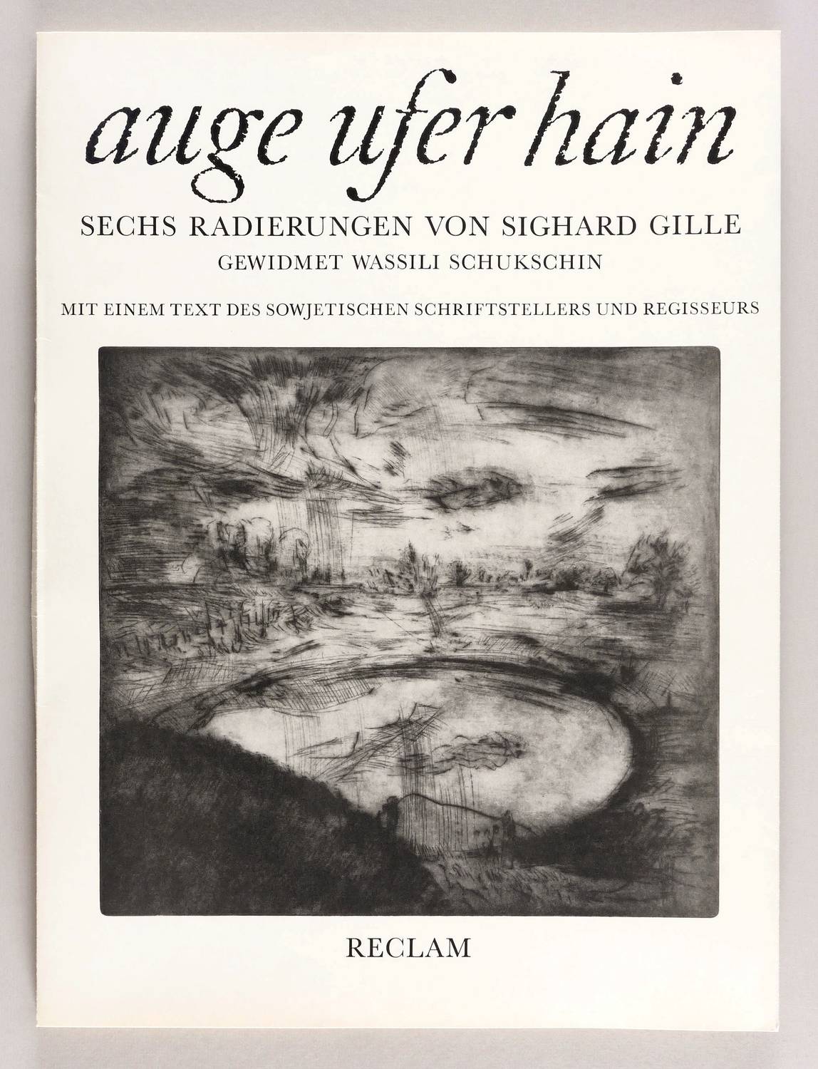 Aus: Sighard Gille, auge ufer hain. Sechs Radierungen, gewidmet Wassili Schukschin (Leipzig: Reclam 1987). – Sämtliche Blätter rechts unten in Bleistift signiert und datiert: ″Gille 86″. Links Auflagenbezeichnung, mittig Titel. Impressum in Kugelschreiber nummeriert. – Originalgrafisches Mappenwerk mit 6 von Sighard Gille 1986 gedruckten Radierungen mit einem Text von Wassili Schukschin, Mappengestaltung Friederike Pondelik, Leipzig. – Vollständig mit Umschlag, Titelblatt, Textblättern und Impressum. Im originalen Pappschuber. Sehr guter Zustand.