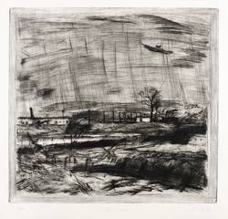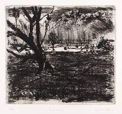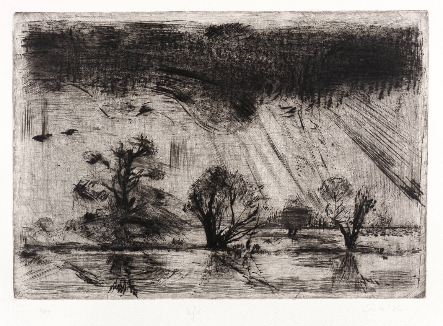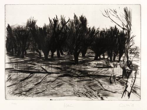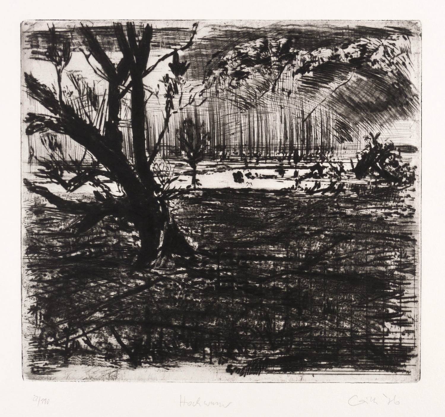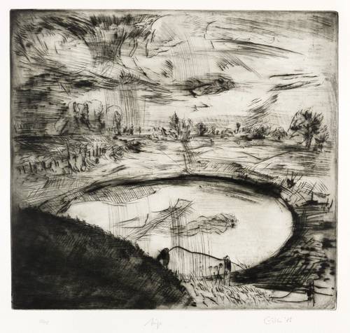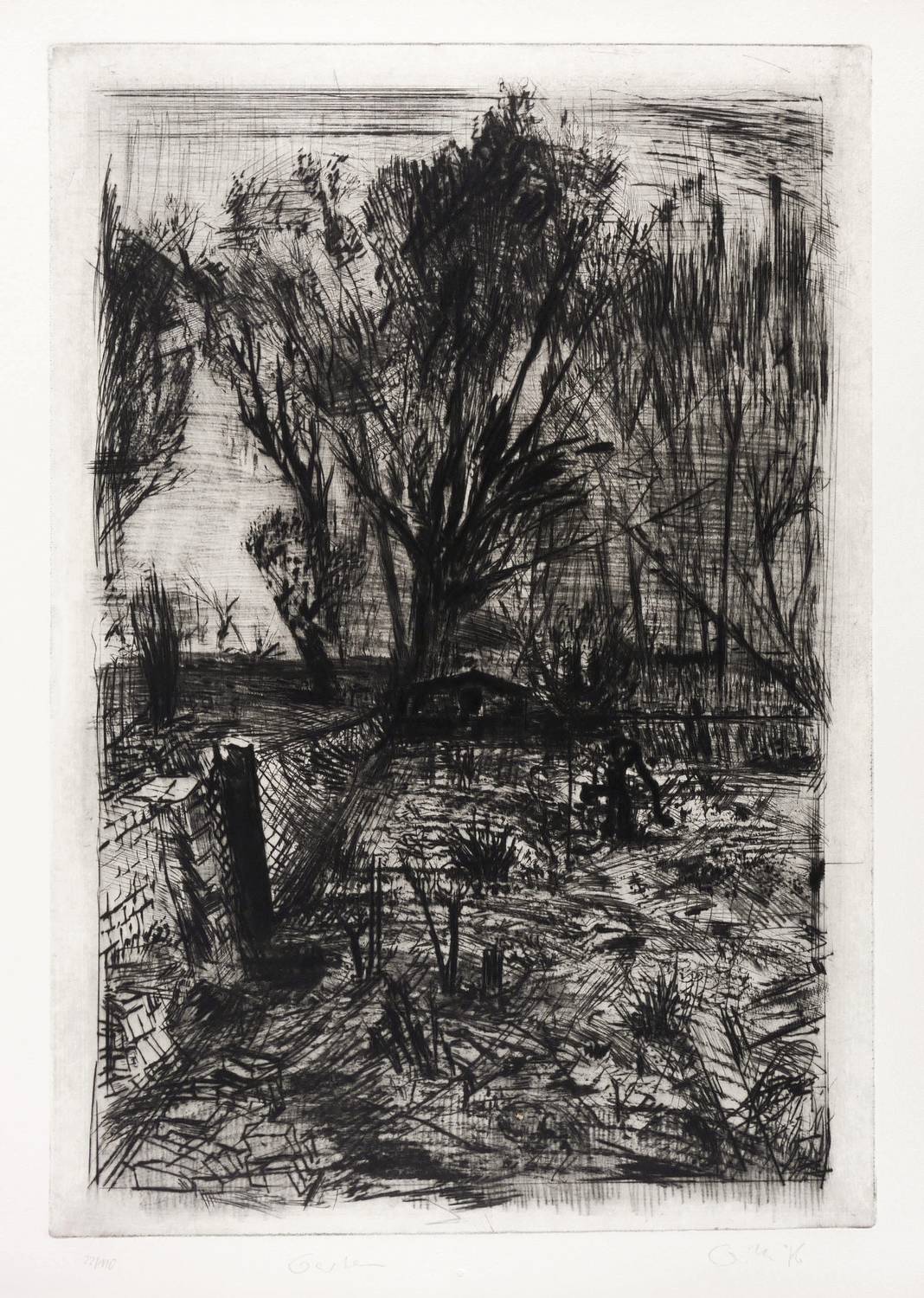 Aus: Sighard Gille, auge ufer hain. Sechs Radierungen, gewidmet Wassili Schukschin (Leipzig: Reclam 1987). – Sämtliche Blätter rechts unten in Bleistift signiert und datiert: ″Gille 86″. Links Auflagenbezeichnung, mittig Titel. Impressum in Kugelschreiber nummeriert. – Originalgrafisches Mappenwerk mit 6 von Sighard Gille 1986 gedruckten Radierungen mit einem Text von Wassili Schukschin, Mappengestaltung Friederike Pondelik, Leipzig. – Vollständig mit Umschlag, Titelblatt, Textblättern und Impressum. Im originalen Pappschuber. Sehr guter Zustand.