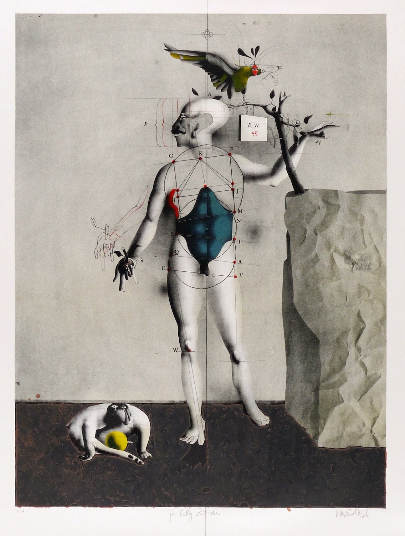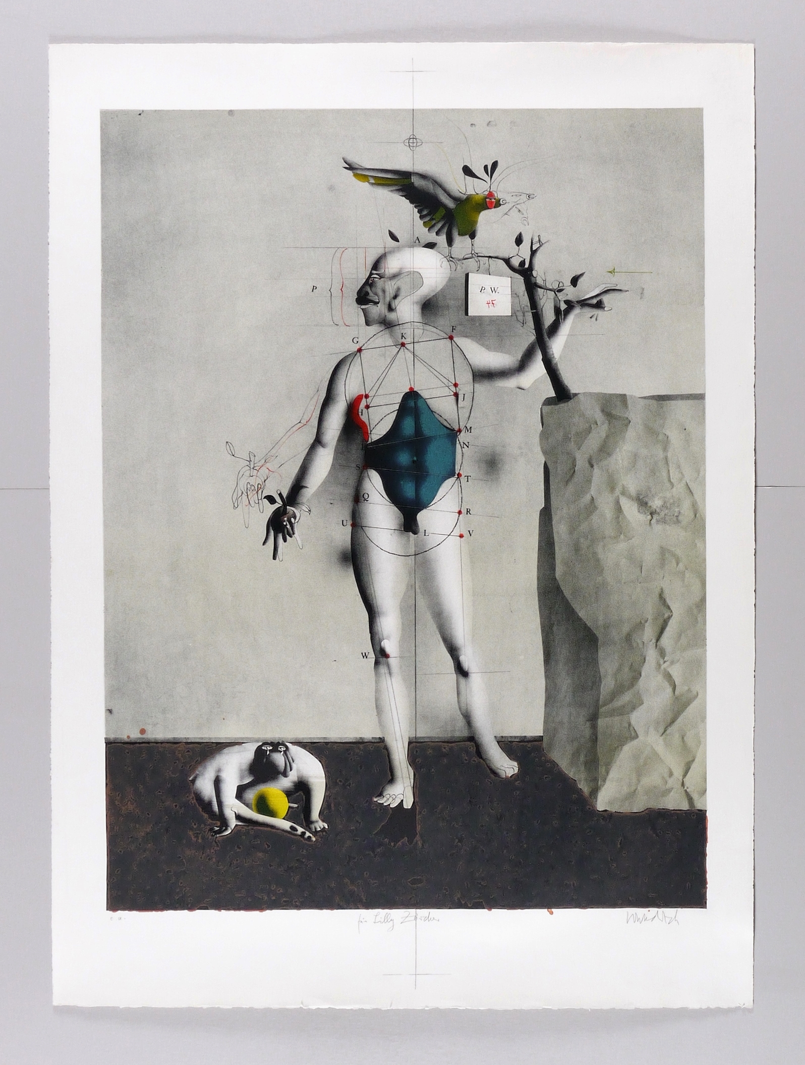 Riediger 486. – Rechts unten unter der Darstellung in Bleistift signiert: ″Wunderlich″. Links Auflagenbezeichnung: ″e.a.″ Mittig persönliche Widmung. Im Stein diverse Inschriften, darunter: ″P.W. 74″. Wasserzeichen von BFK Rives France. – Druck bei Matthieu in Dielsdorf, Schweiz, auf der berühmten Steindruckpresse Johannisberg 1911. – 1 von 12 Künstlerexemplaren zu einer Auflage von 125 signierten und nummerierten Exemplaren. – Nicht die gleichformatige Reproduktion im Siebdruck! – Ohne Mangel. Sehr guter Zustand.