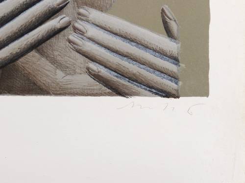 Lutze 745 (2) a. – Rechts unten in Bleistift signiert: ″Antes″. Links eigenhändige Widmung: ″für Frau Zürcher″. Mittig datiert: ″13.XII 74″. Wasserzeichen BFK Rives France. – Druck der Matthieu AG in Dielsdorf (Schweiz) auf der Steindruckpresse Johannisberg 1911, auf der Emil Matthieu (1919-1980) und Ernst Hanke für Alberto Giacometti, Oskar Kokoschka, Marino Marini, Hans Erni und Sam Francis druckten. – Edition Volker Huber, Offenbach. – Widmungsexemplar. Insgesamt umfängt die Auflage 200 signierte und nummerierte Exemplare. – Kaum merkliche leichte Randmängel. Kleiner Papierverlust der rechten oberen Blattecke weit außerhalb der Darstellung restauratorisch ergänzt. Deshalb noch guter Zustand.