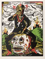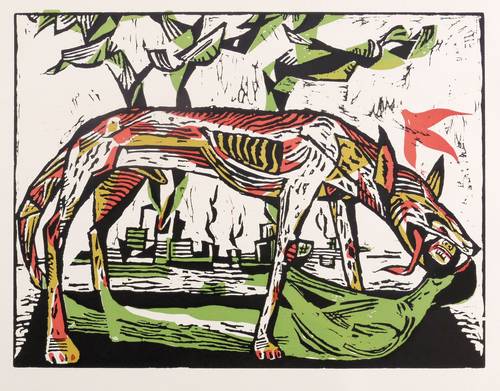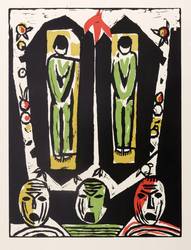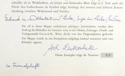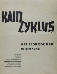 Aus: Axl Leskoschek, Kain-Zyklus (Wien: Eigenverlag 1964). – Im Impressum in blauer Feder signiert: ″Axl Leskoschek″. Dazu Exemplarnummer. Persönliche Widmung: ″Erhard in Dankbarkeit und Liebe, Inge in Liebe, beiden in Freundschaft″. – Folge der Drucke: 1. Kain ist der Mörder schlechtweg / sein Zeichen, das Kainszeichen, bezeichnet alles Tödliche. 2. Der Mensch ist dem Menschen ein Wolf. - 3. Der Sieger. - 4. Die im Schafpelz. - 5. Die gegen das Übel kämpfen / selbst ihr Leben hingeben. - 6. Die neue Saat. - 7. Feuer vom Himmel. - 8. Der tödliche Fisch. - 9. ″Wir wollen nicht mehr″. - 10. Zueinander im Dschungel. - 11. Der Friede. – Provenienz: Sammlung Inge & Erhard Frommhold, Dresden, später Sammlung Gerlint Söder, Dresden. – Vollständig mit allen Grafiken, Titelblatt-Textblatt-Impressum, Inhaltsangabe und Umschlag. Die Papiere altersbedingt schwach gegilbt und mit leichten Griffspuren. Umschlag mit Lagerspuren, im Bereich des Titels mit oberflächlichem Materialverlust. Mäßig guter bis guter Zustand.