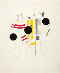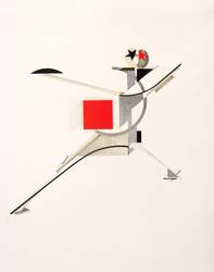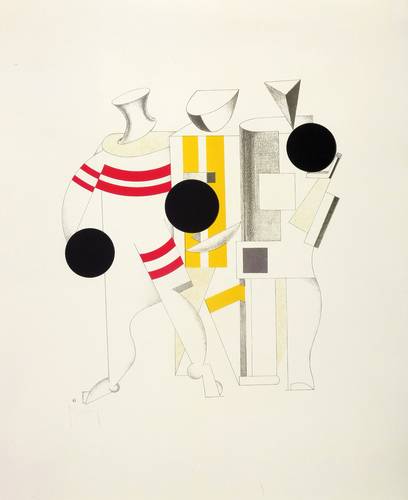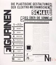 Aus: El Lissitzky, Figurinen. Sieg über die Sonne (Lauenförde: TECTA 1923/1988). – Im Impressum in schwarzem Faserstift nummeriert: ″X / H.C.″ – Neuedition der 1923 unter demselben Titel in Hannover erschienen Mappe ″Figurinen. Sieg über die Sonne″, herausgegeben von Axel Bruchhäuser, in Zusammenarbeit mit dem Sprengel-Museum Hannover. – Folge der Tafeln: 1. Teil der Schaumaschinerie. 2. Ansager. - 3. Posten. - 4. Ängstliche. - 5. Globetrotter (in der Zeit). - 6. Sportsmänner. - 7. Zankstifter. - 8. Alter (Kopf 2 Schritt hinten). - 9. Totengräber. - 10. Neuer. – Eines von 50 römisch nummerierten Exemplaren honoris causa. – Provenienz: Sammlung Erhard Frommhold, Dresden. – Vollständig mit allen Grafiken, Titelblatt, beigegebenem 4-seitigen Heft und Impressum sowie Umschlag. Die Tafeln mit kaum merklichen Druckstellen in den Ecken. Umschlag mit minimalen Lagerspuren. Guter Zustand.