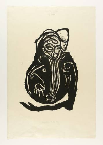 1992. Holzschnitt, in Schwarz, auf rauem gelblichem Japanbütten. – Originale Künstlergrafik, von Carsten Nicolai. – 61,0 x 43,4 cm (Darstellung / Druckbild), 98 x 65 cm (Blatt).