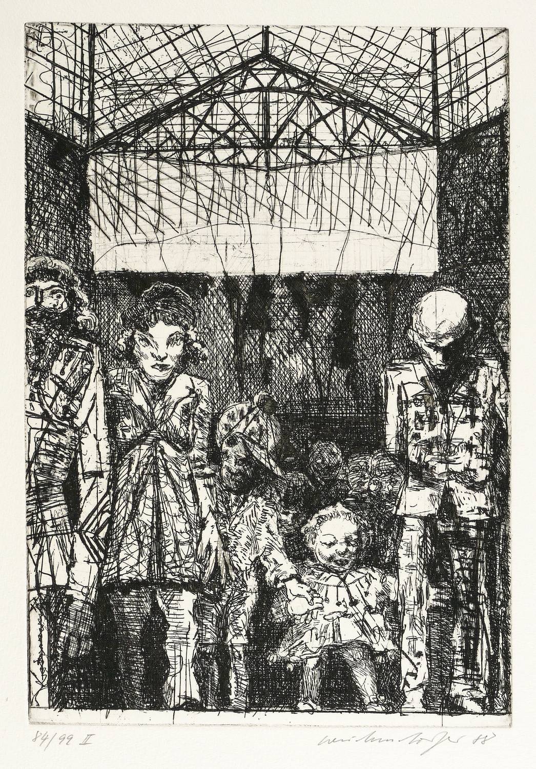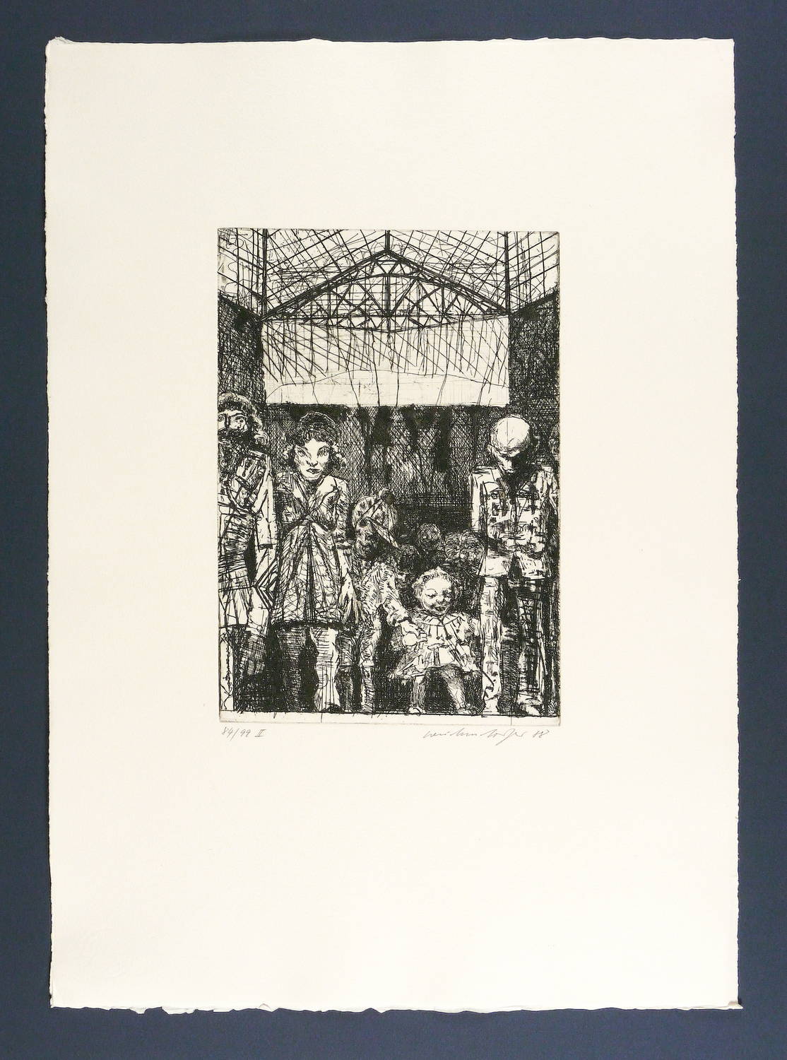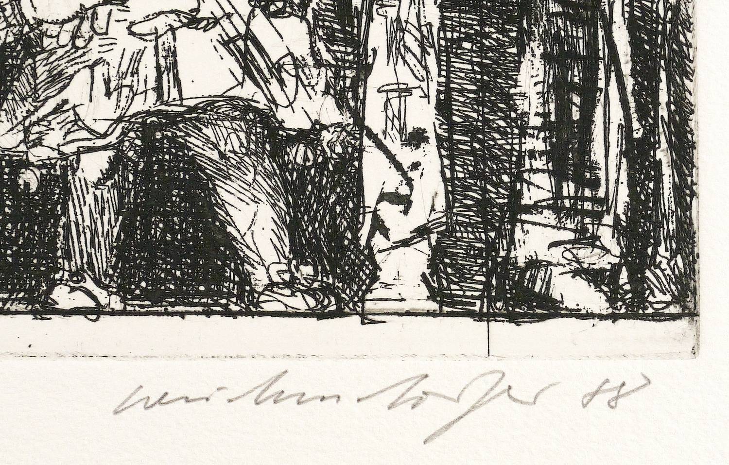 1988. Radierung / Strichätzung, in Schwarz, auf hellchamois Hahnemühle. – Originale Künstlergrafik, von Claus Weidensdorfer. – Auflage Exemplar Nr. 84/99. – 28,4 x 19,8 cm (Darstellung / Platte), 56 x 40 cm (Blatt).