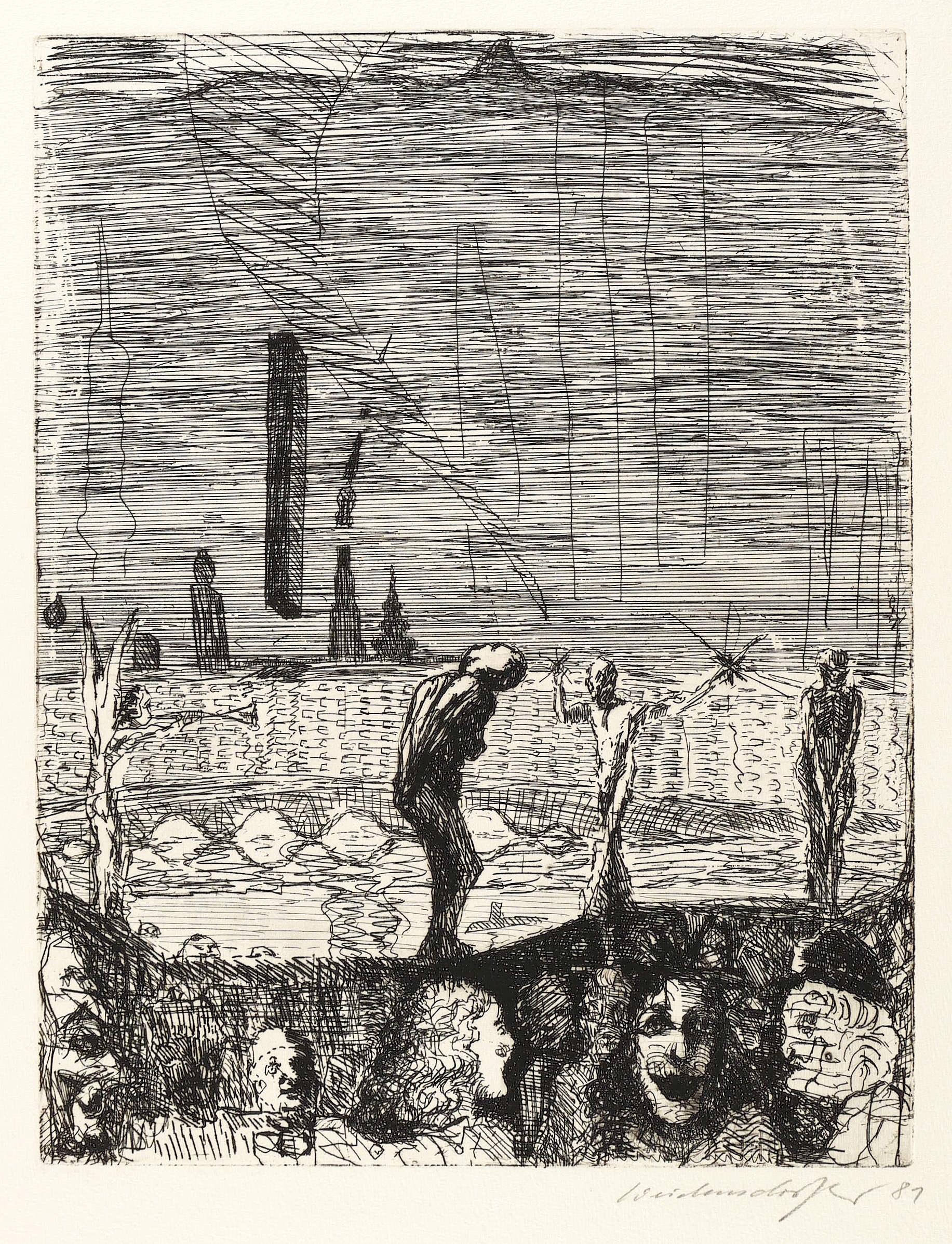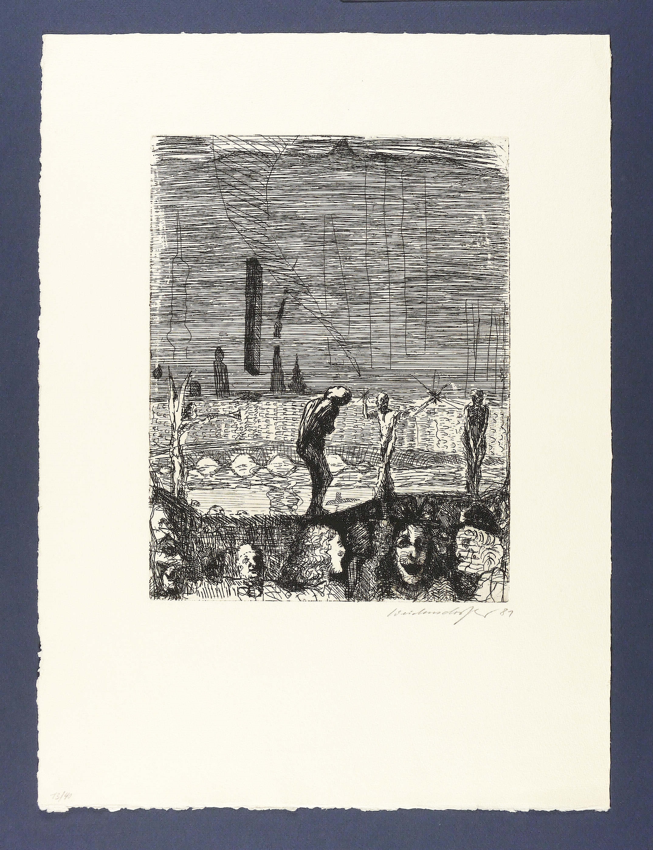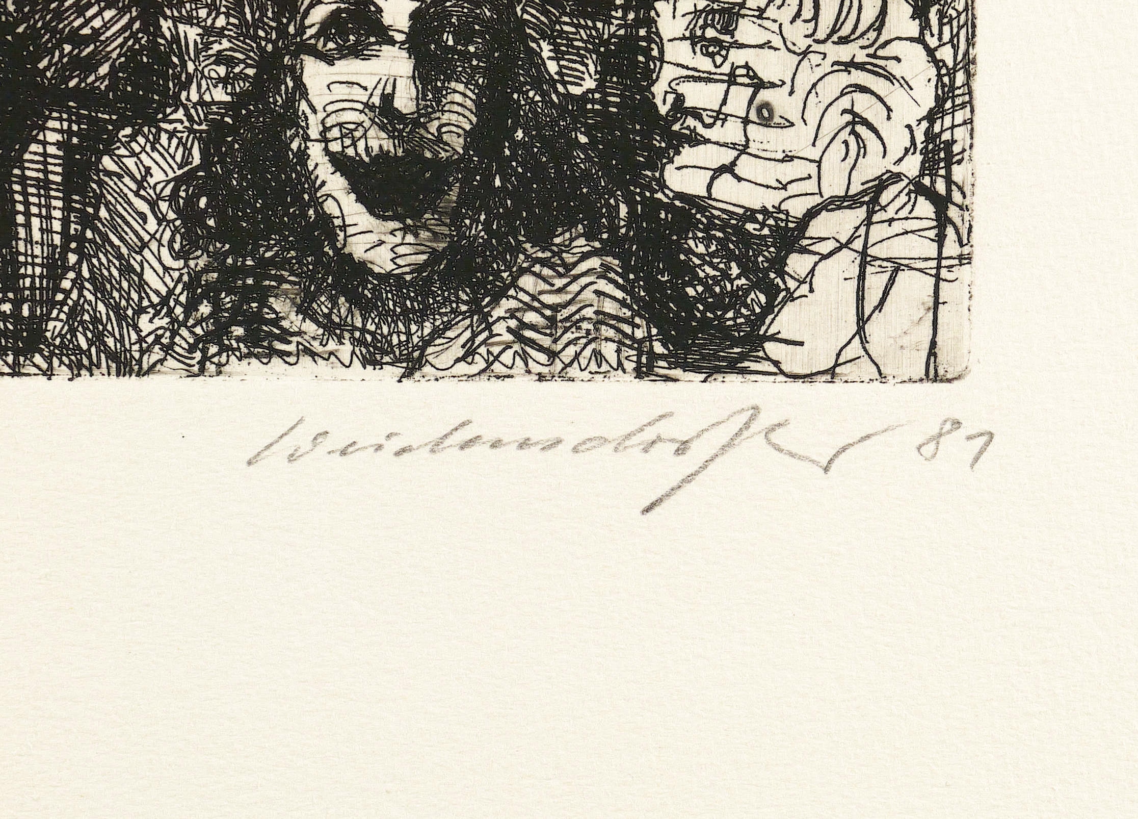 1981. Radierung / Strichätzung, in Schwarz, auf schwerem hellgelbem Büttenpapier. – Originale Künstlergrafik, von Claus Weidensdorfer. – Auflage Exemplar Nr. 13/40. – 32,1 x 24,7 cm (Darstellung / Platte), 53,5 x 39,5 cm (Blatt).