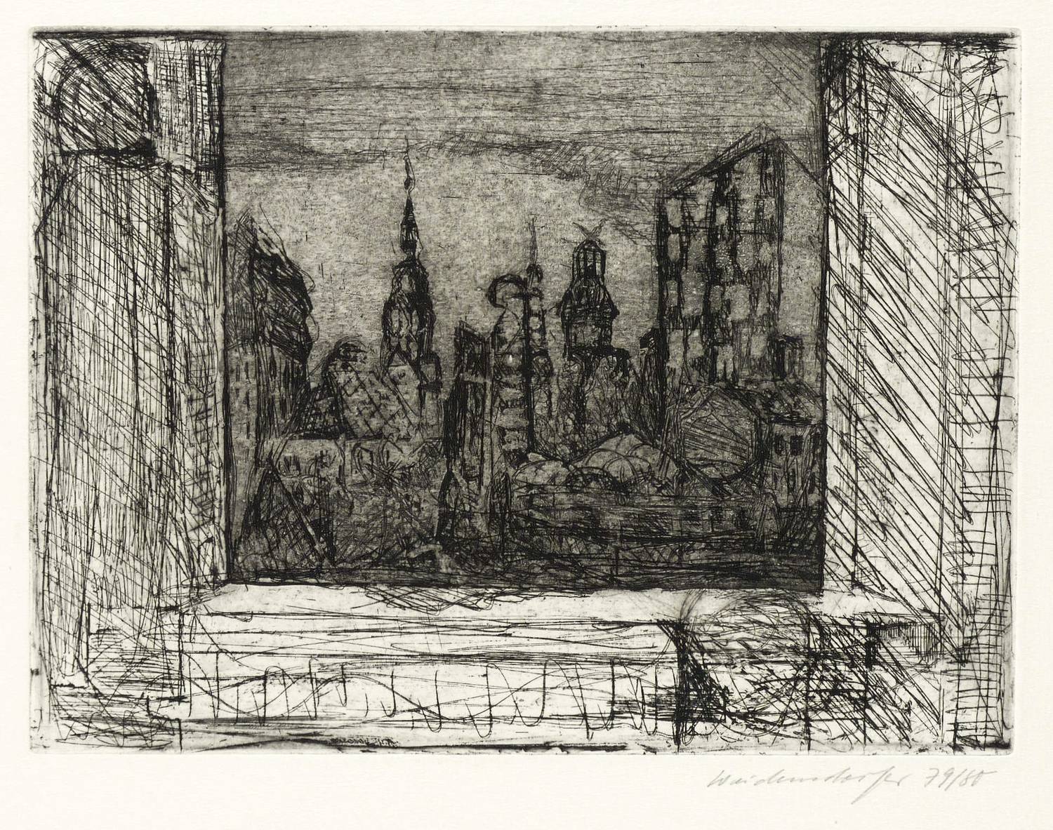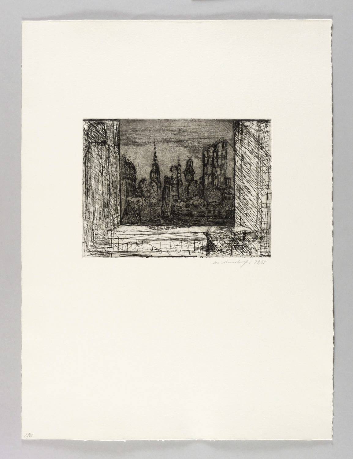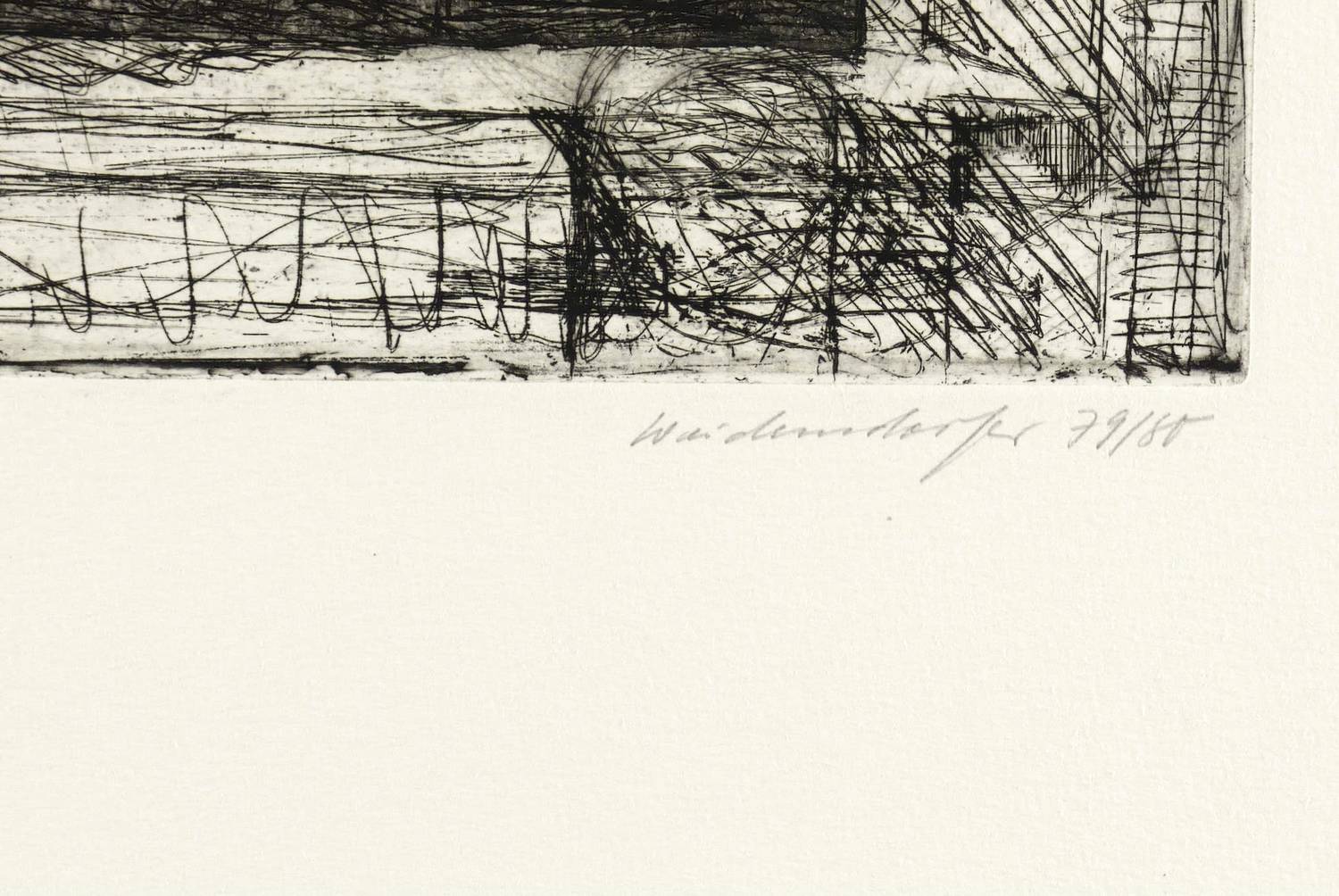 1979/1980. Radierung / Strichätzung & Aquatinta, in Schwarz, auf weißem Velinkarton. – Originale Künstlergrafik, von Claus Weidensdorfer. – Auflage Exemplar Nr. 2/40. – 17,8 x 24,1 cm (Darstellung / Platte), 53,5 x 40 cm (Blatt).