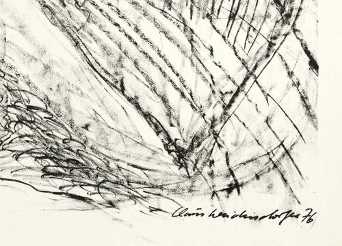 1976. Lithografie / Kreidelithografie, in Schwarz, auf hellgelbem Karton. – Originale Künstlergrafik, von Claus Weidensdorfer. – 40,2 x 32,7 cm (Darstellung), 41 x 37 cm (Blatt).