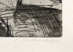 1961. Radierung / Strichätzung & Aquatinta, in Schwarz, auf hartem gelblichen Velin. – Originale Künstlergrafik, von Claus Weidensdorfer. – 20,7 x 14,9 cm (Darstellung / Platte), 35 x 25 cm (Blatt).