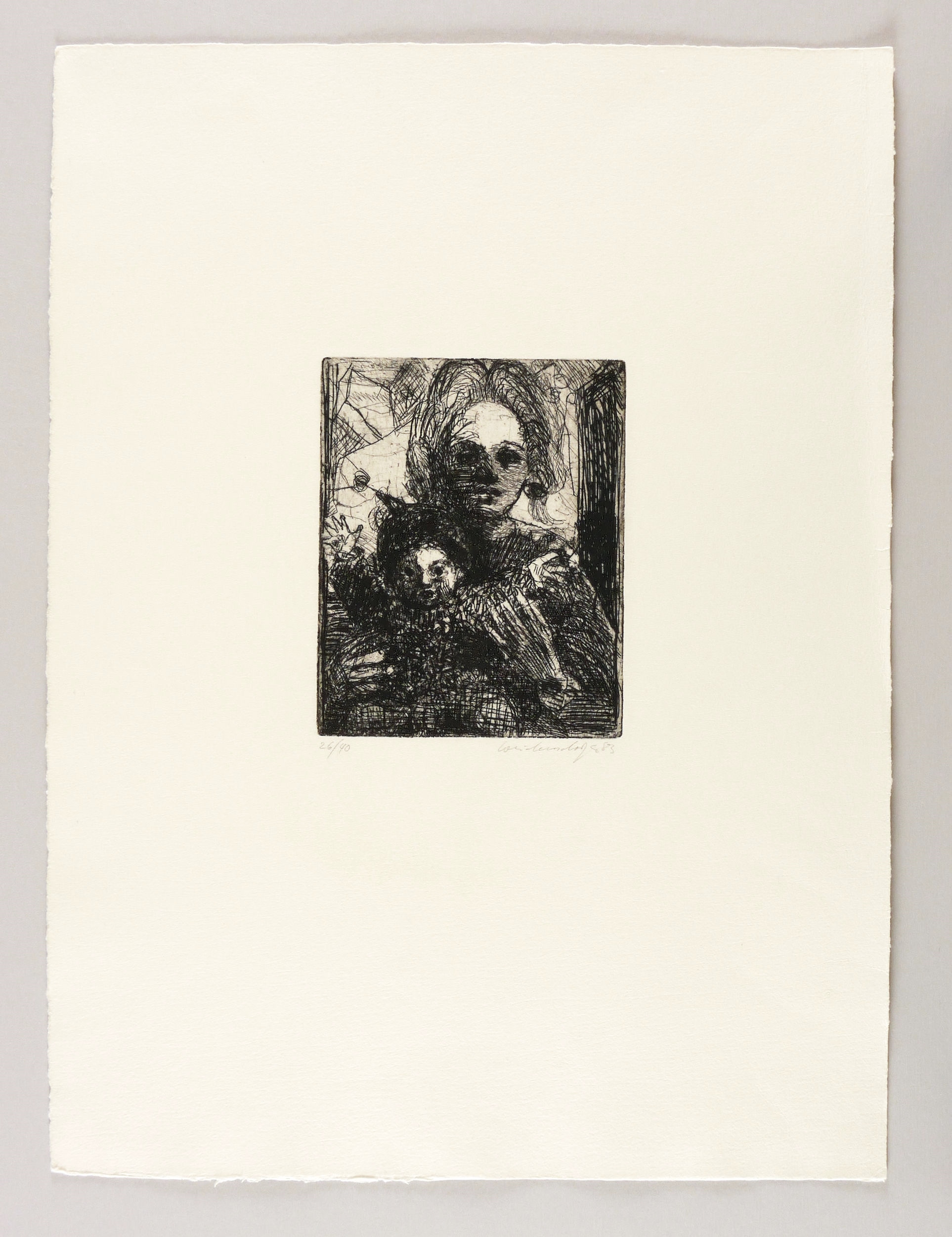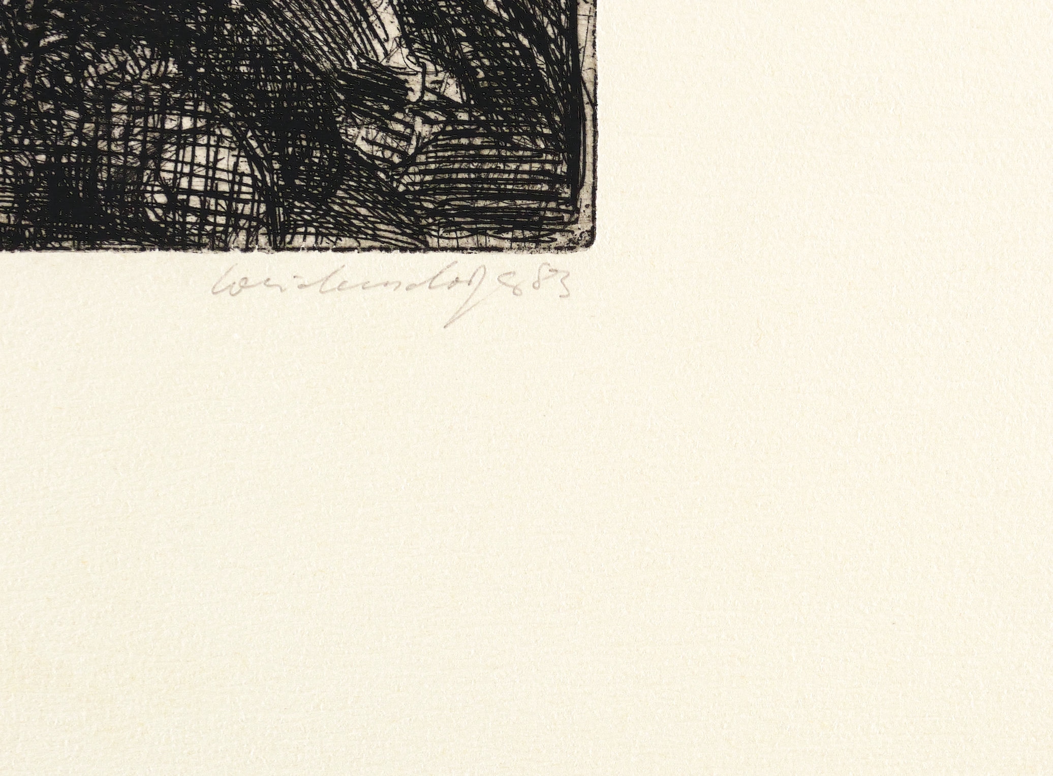 1983. Radierung / Strichätzung, in Schwarz, auf hellchamois Büttenkarton. – Originale Künstlergrafik, von Claus Weidensdorfer. – Auflage Exemplar Nr. 26/40. – 17,8 x 14,3 cm (Darstellung / Platte), 53 x 40 cm (Blatt).