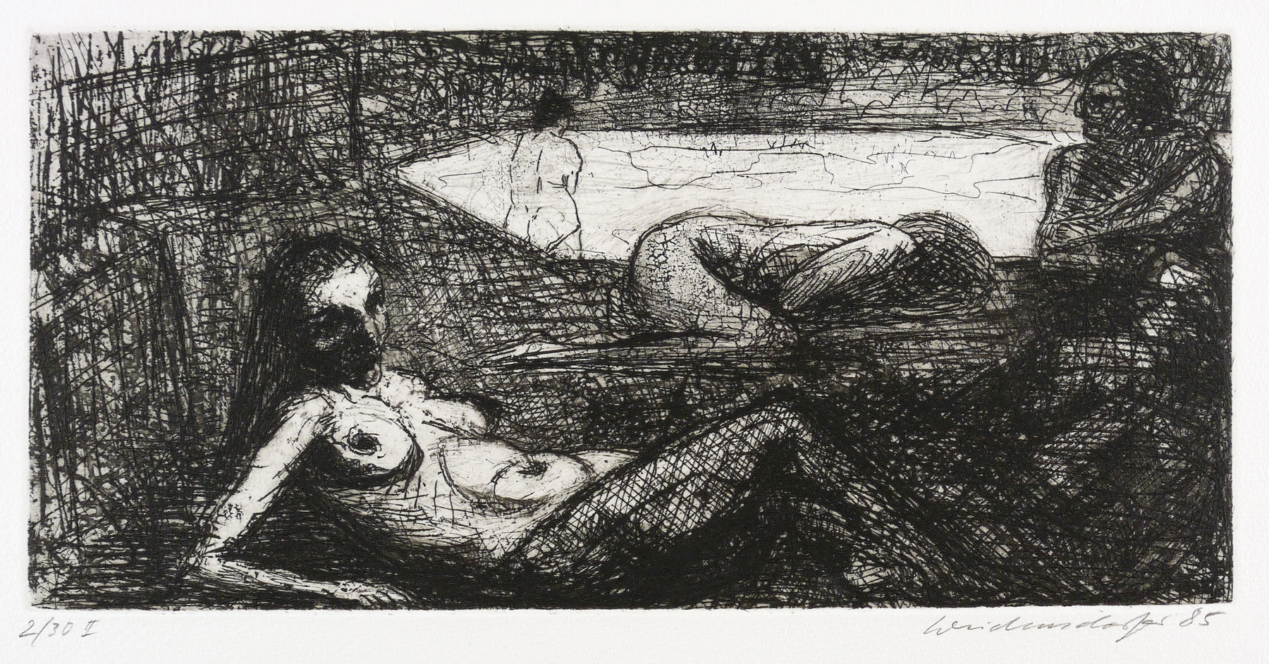 1985. Radierung / Strichätzung & Kaltnadel, in Schwarz, auf kräftigerem hellchamois Velin. – Originale Künstlergrafik, von Claus Weidensdorfer. – Auflage Exemplar Nr. 2/30. – 15,4 x 31,7 cm (Darstellung / Platte), 30 x 40 cm (Blatt).