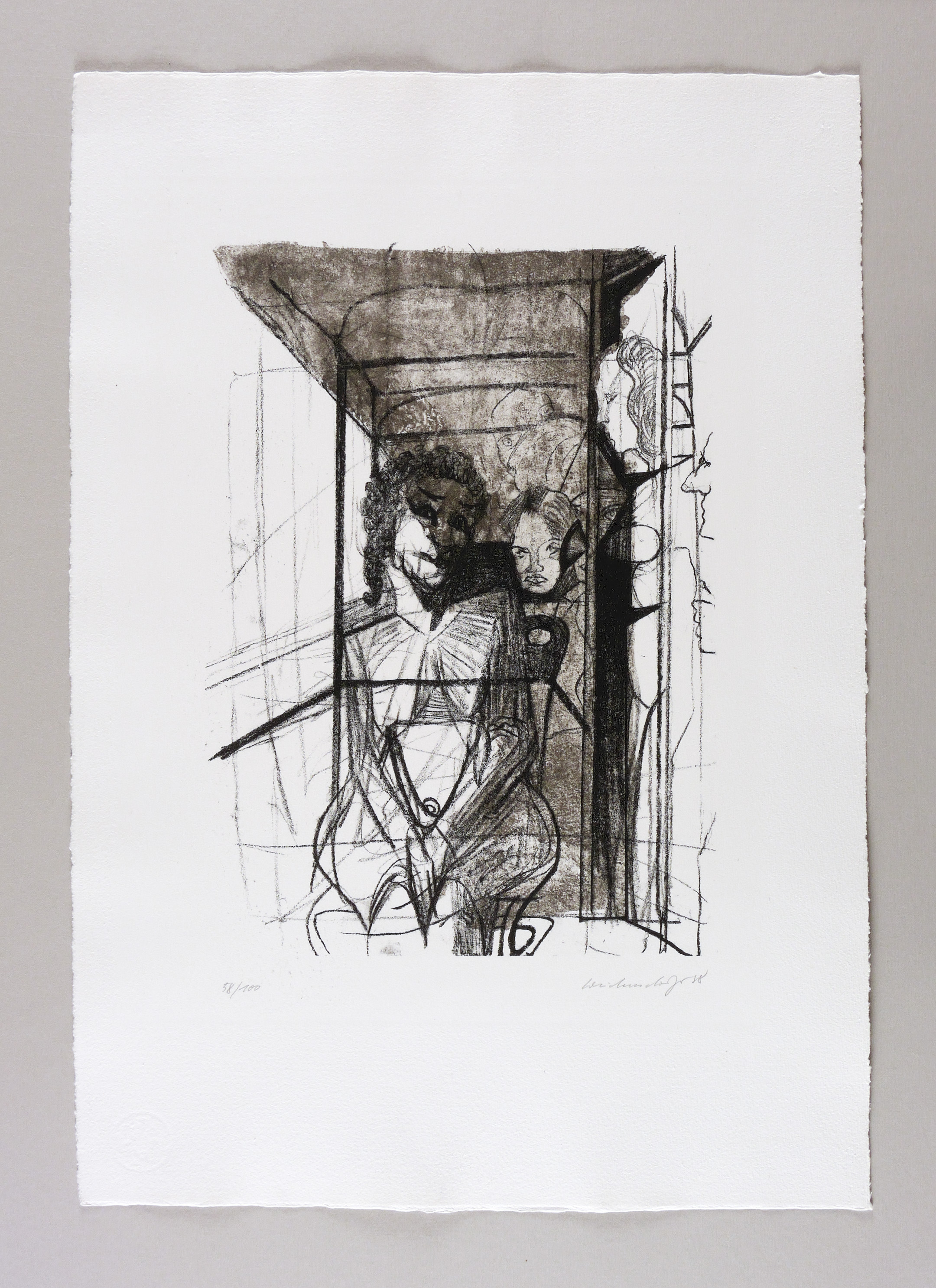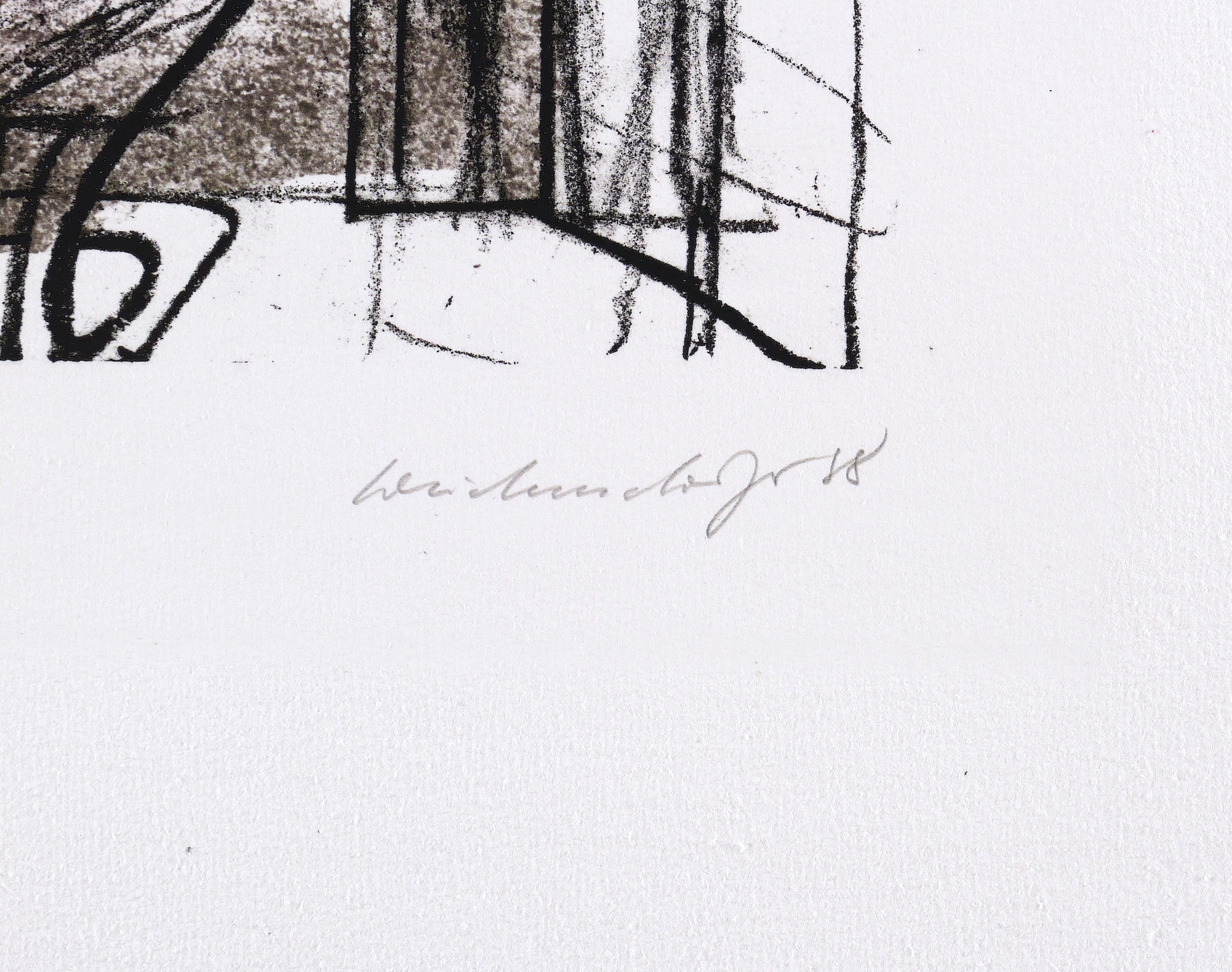 1988. Lithografie / Kreidelithografie, in Schwarz, auf festem hellchamois Hahnemühle-Bütten. – Originale Künstlergrafik, von Claus Weidensdorfer. – Auflage Exemplar Nr. 58/100. – 35,5 x 25,4 cm (Darstellung / Druckbild), 57 x 40 cm (Blatt).