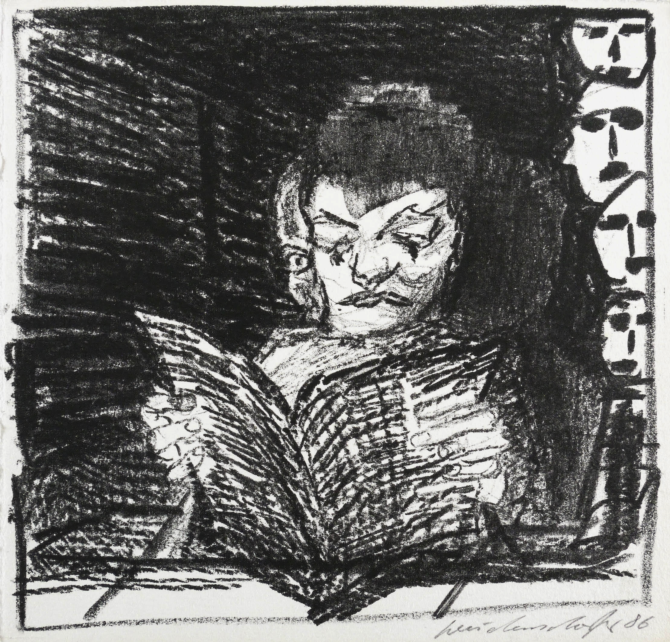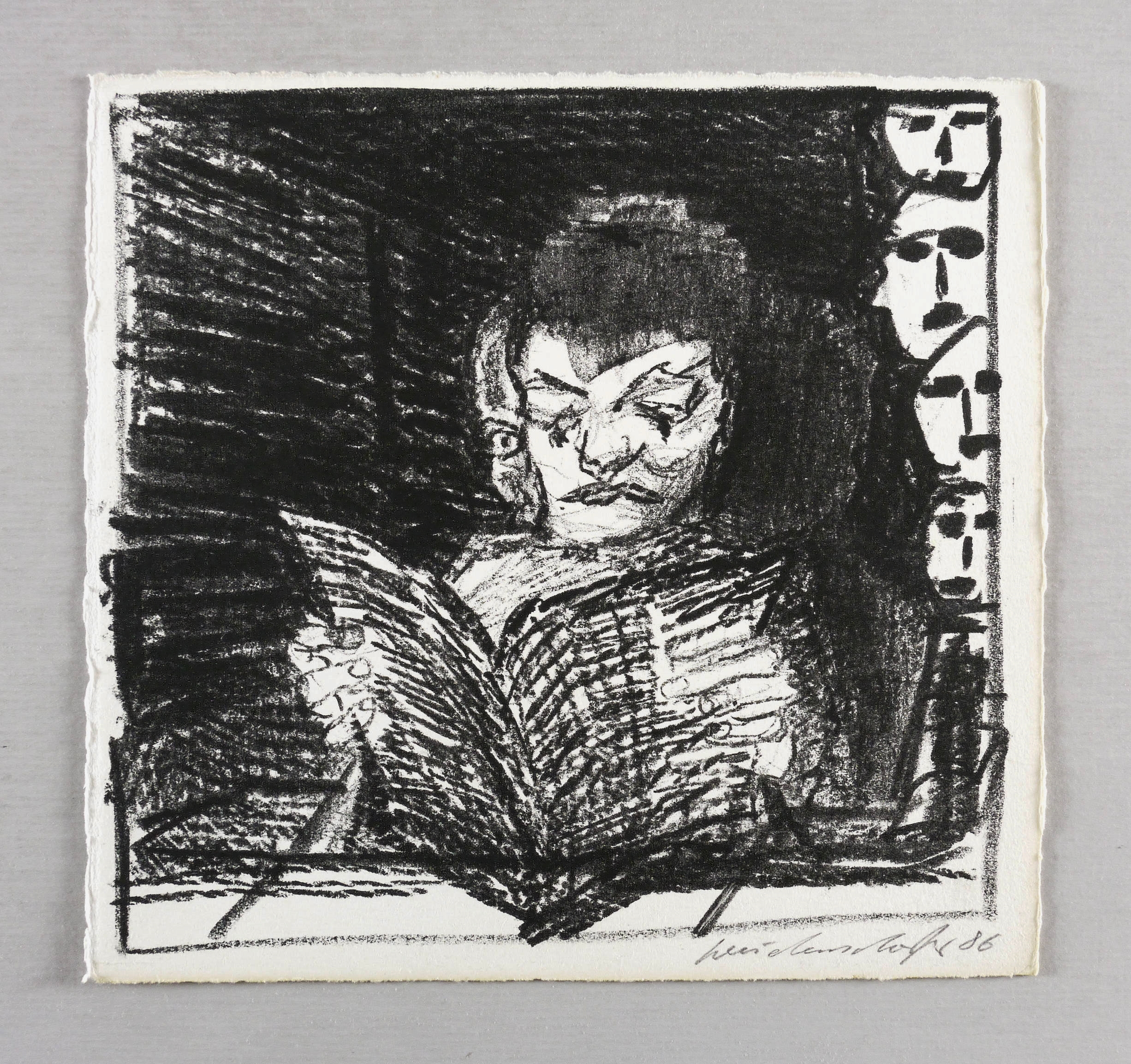 1986. Lithografie / Kreidelithografie, in Schwarz, auf festem chamois Velin. – Originale Künstlergrafik, von Claus Weidensdorfer. – 19,1 x 20,1 cm (Blatt), 18,1 x 19,3 cm (Darstellung / Druckbild).