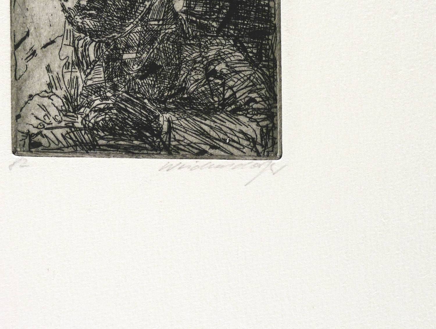 Muschter 378. – Rechts unten in Bleistift signiert: ″Weidensdorfer″. Links Jahr: ″82″. In der Blattecke links unten Auflagenbezeichnung: ″10/40″. Rechts unten bezeichnet: ″(eine Hommage)″. – Wohl im Zusammenhang mit dem Radier- Zyklus ″Kleine Köpfe″ entstanden. – Sehr guter Zustand.
