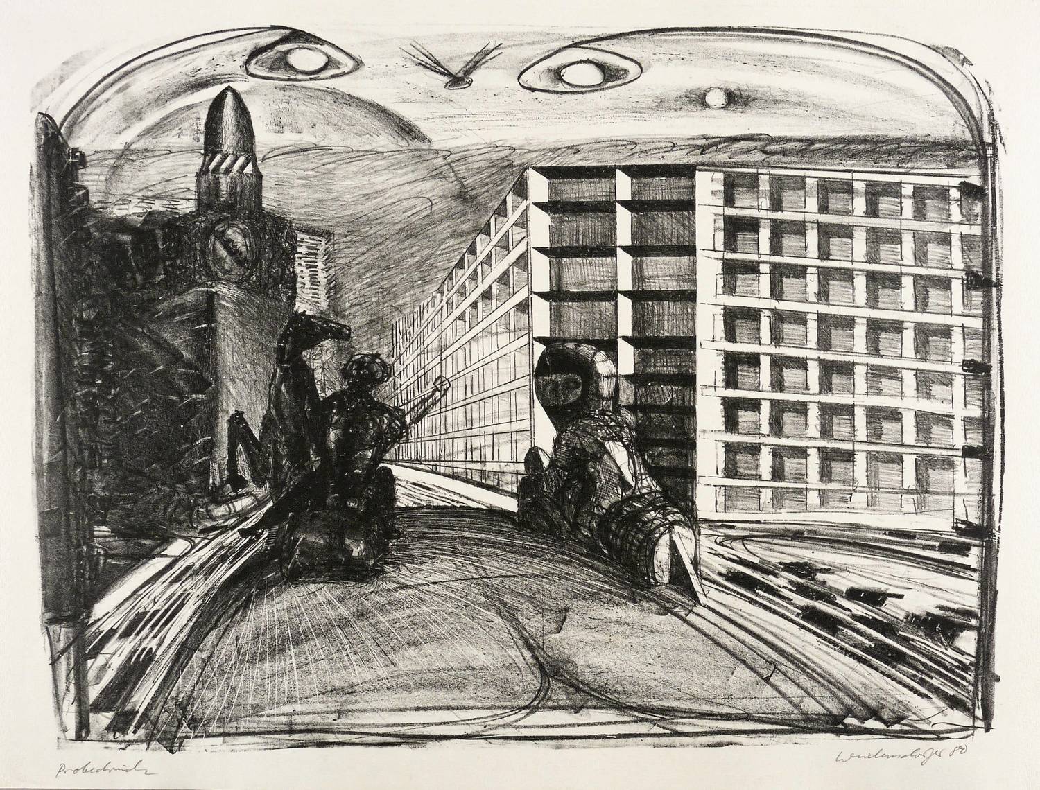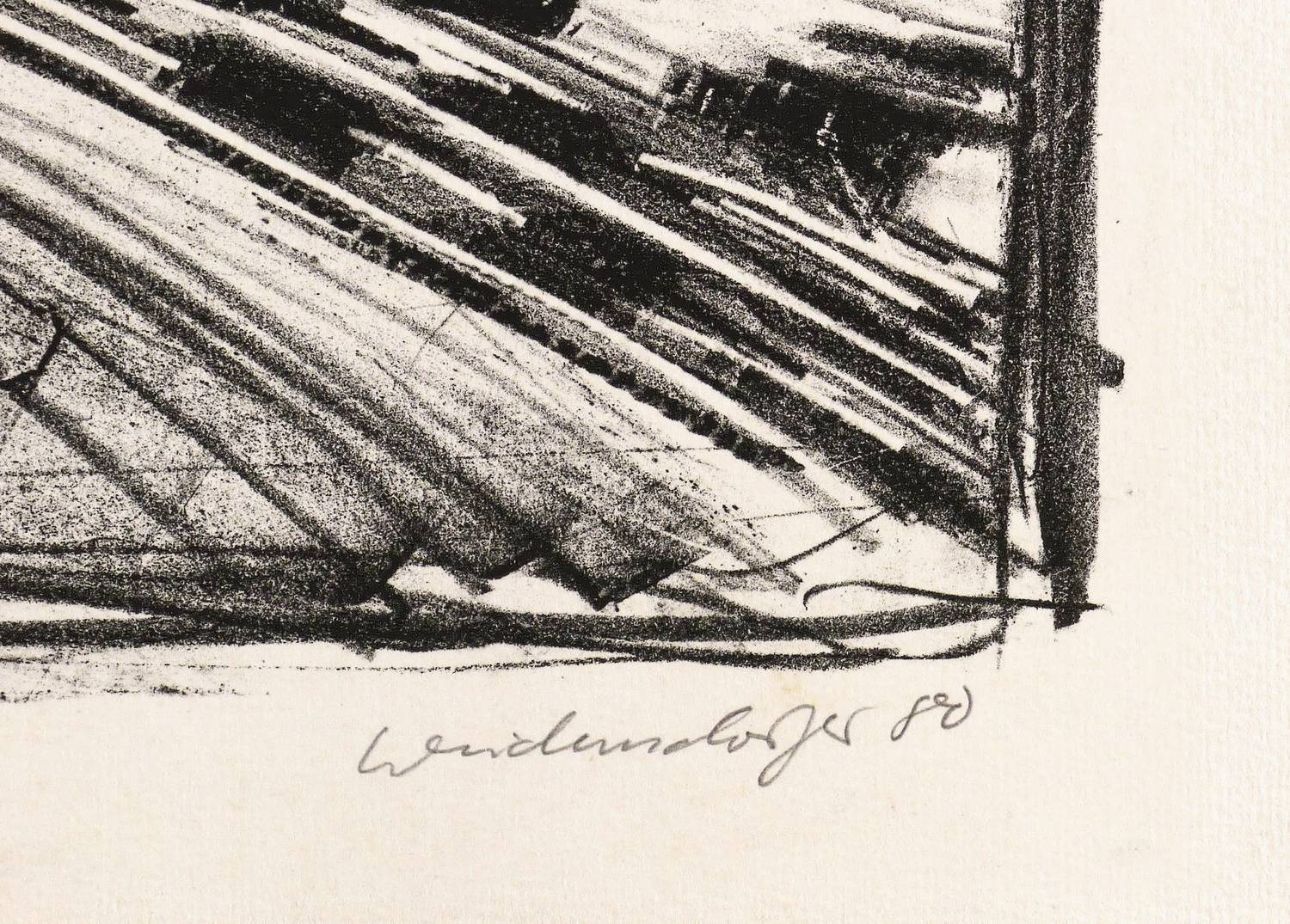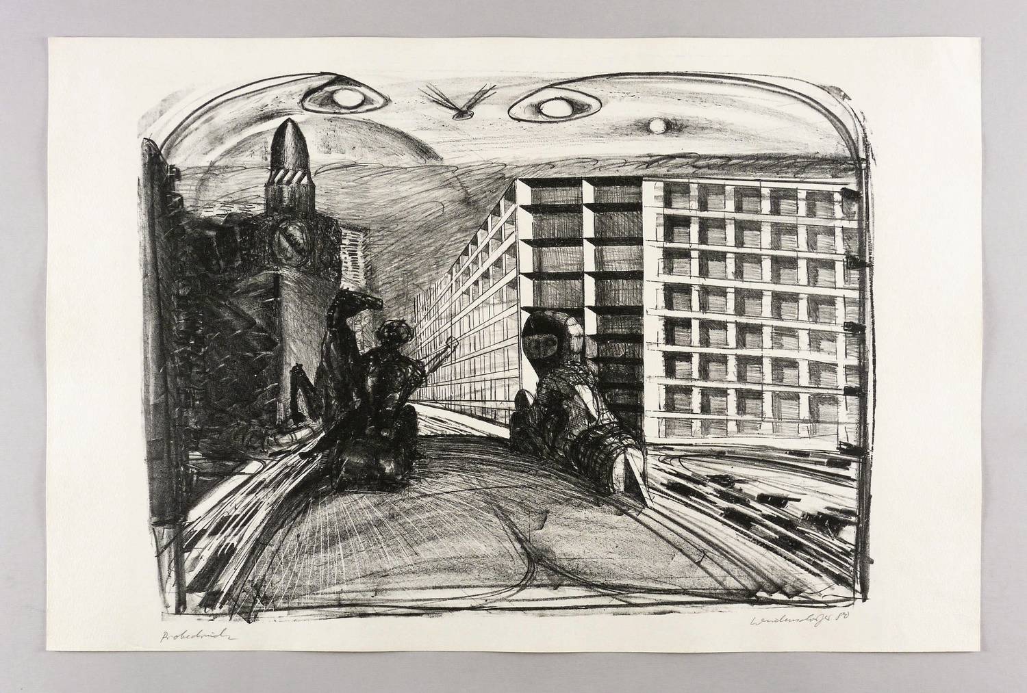1980. Lithografie / Kreide- & Pinsellithografie, partiell geschabt, in Schwarz, auf hellchamois Hahnemühle. – Originale Künstlergrafik, von Claus Weidensdorfer. – Probedruck. – 44,5 x 60,0 cm (Darstellung / Druckbild), 51 x 77 cm (Blatt).
