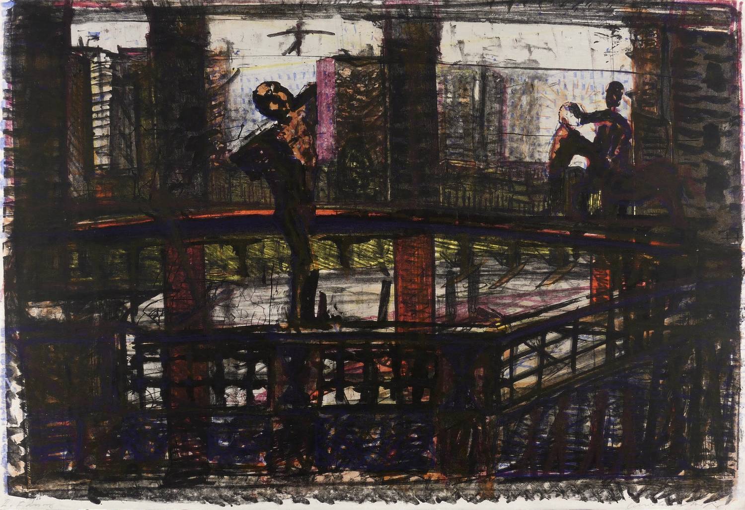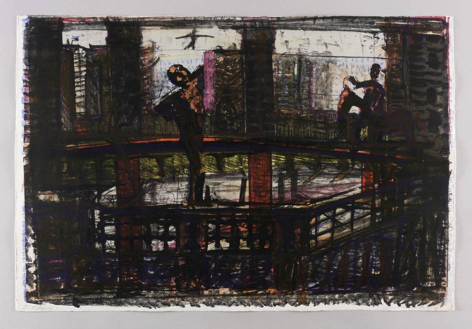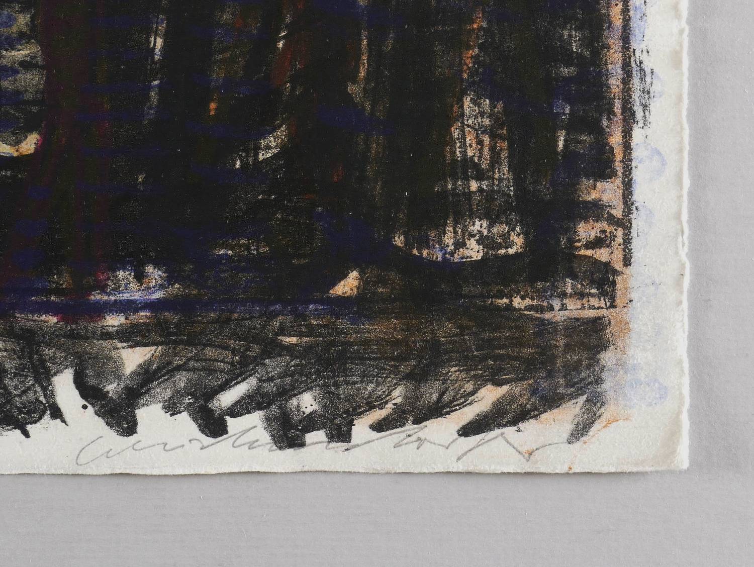 Um 1980. Farblithografie / Kreide- & Pinsellithografie, in 5 Farben, auf schwerem hellchamois Hahnemühle. – Originale Künstlergrafik, von Claus Weidensdorfer. – Druckerexemplar. – 53,2 x 77,5 cm (Darstellung / Druckbild), 54 x 79 cm (Blatt).