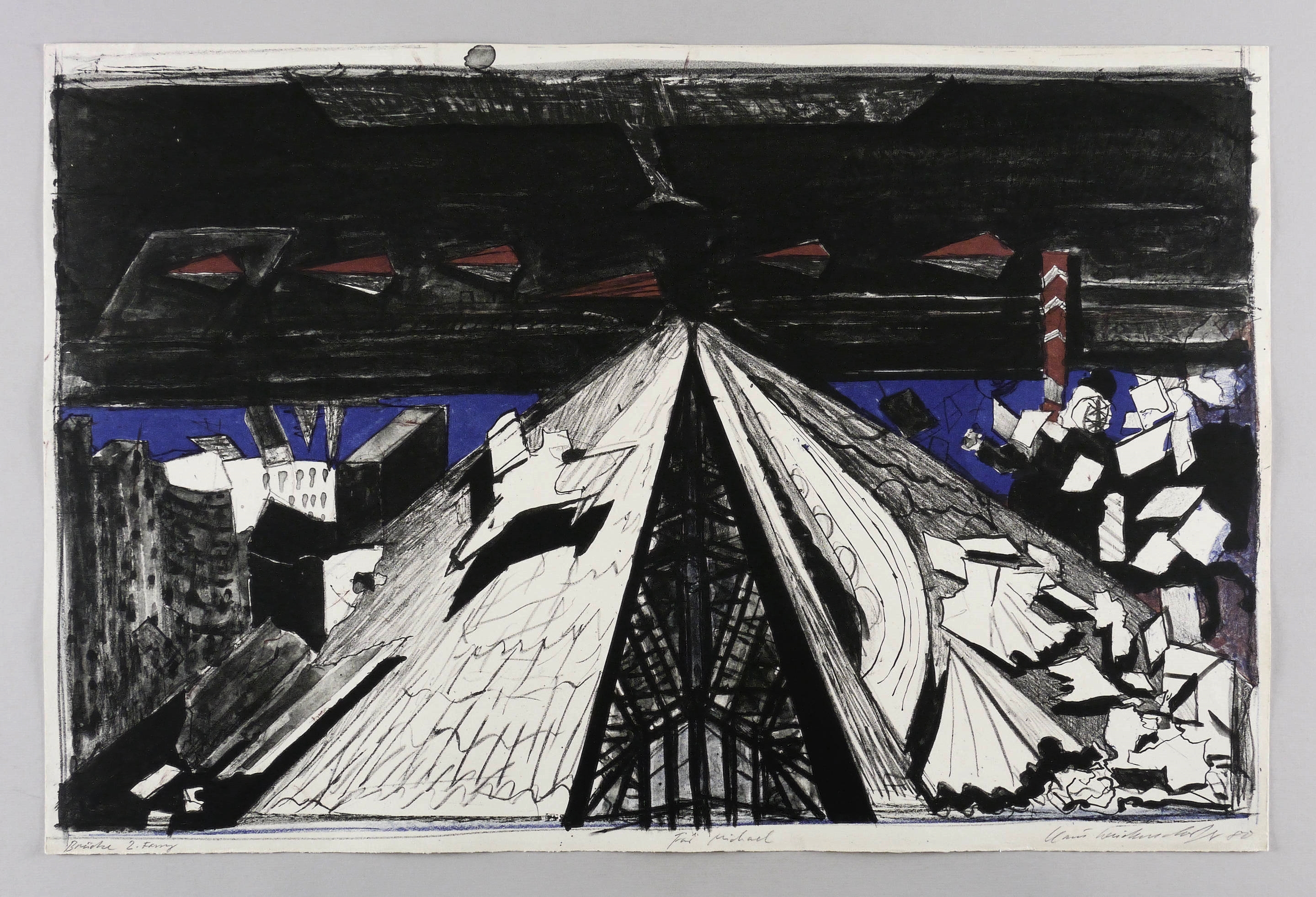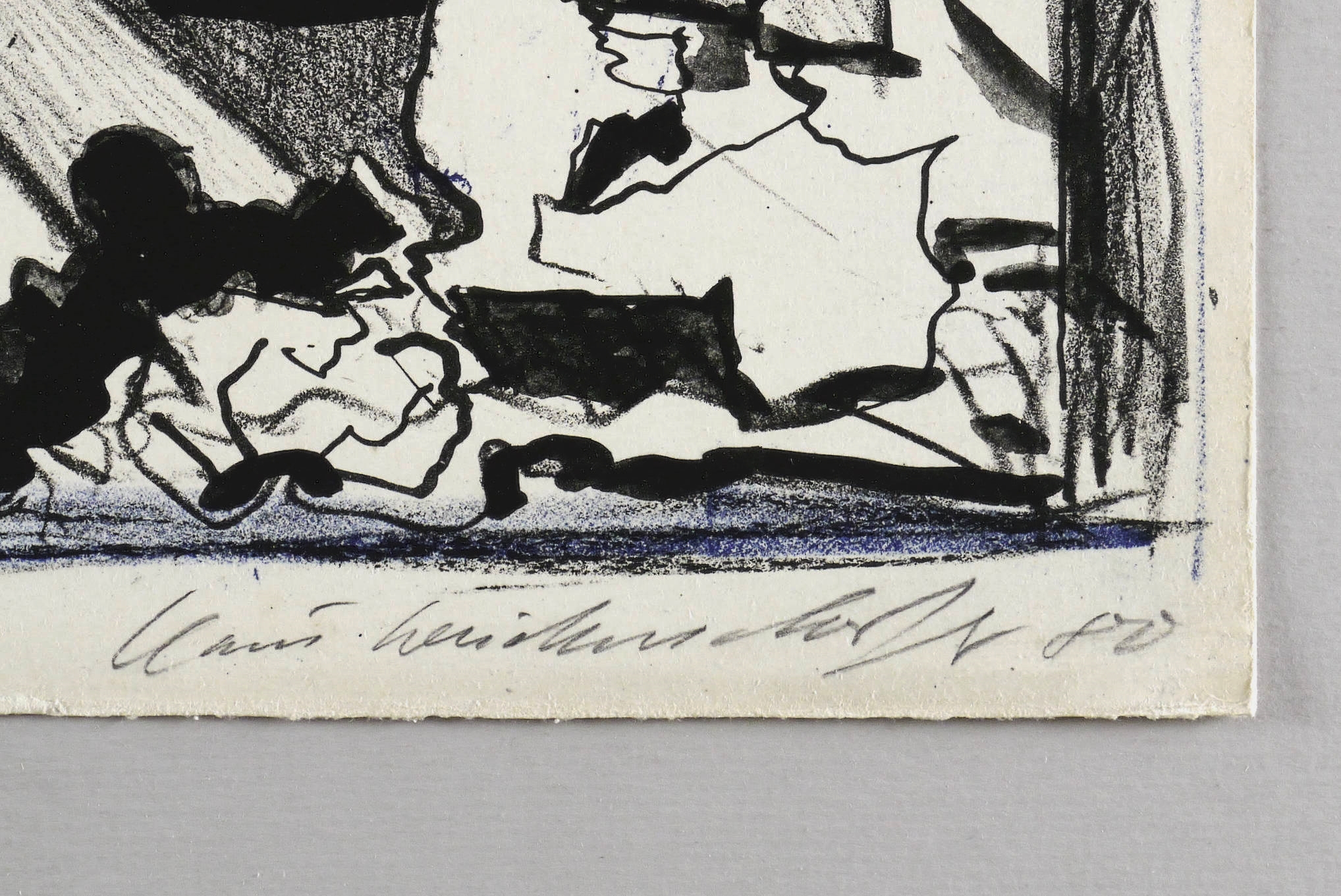 1980. Farblithografie / Kreide-, Feder- & Pinsellithografie, in 3 Farben, auf hellchamois Velin. – Originale Künstlergrafik, von Claus Weidensdorfer. – Druckerexemplar. – 49,3 x 75,0 cm (Darstellung / Druckbild), 51 x 76 cm (Blatt).