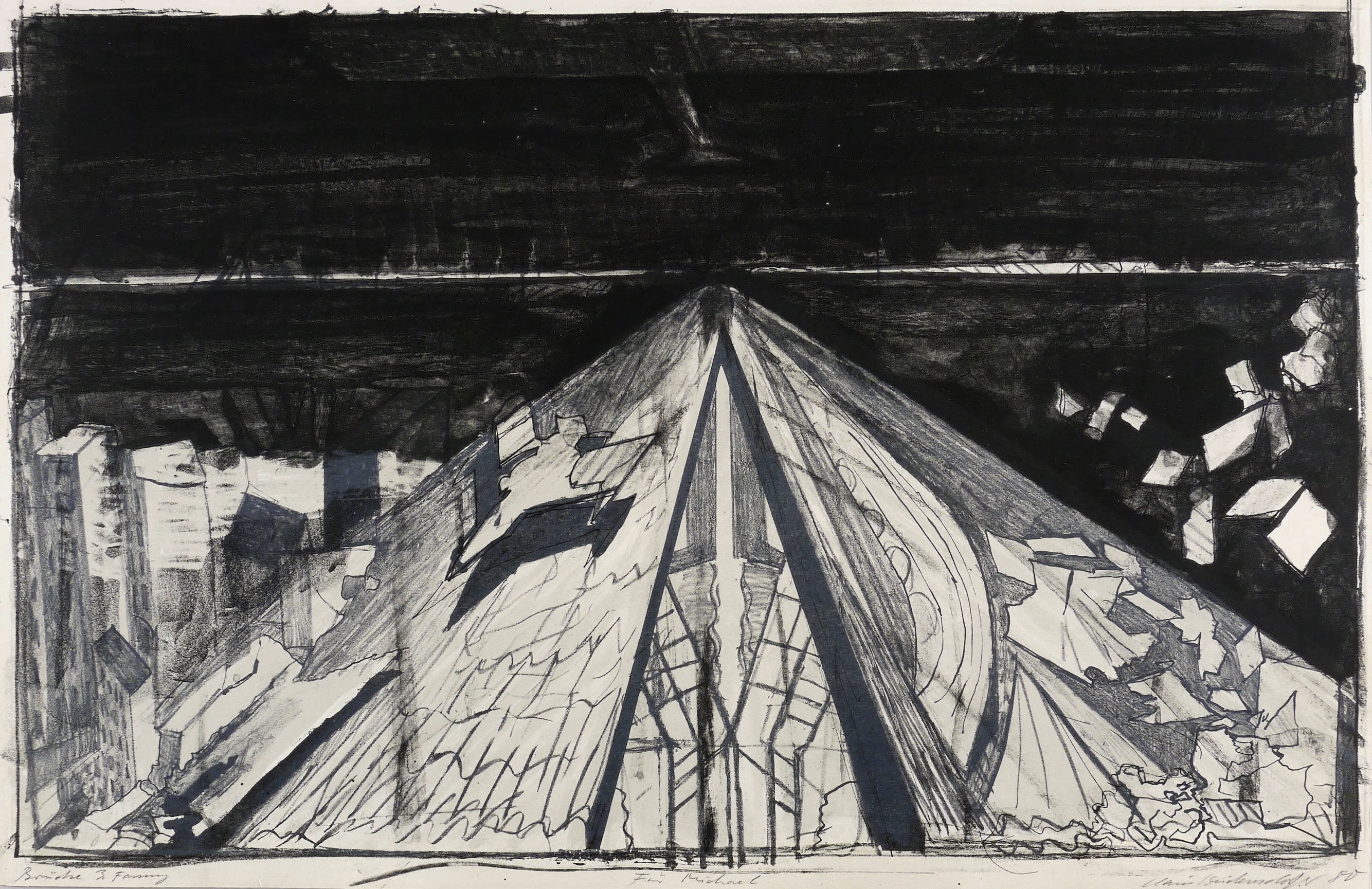 1980. Farblithografie / Kreide-, Feder- & Pinsellithografie, in Grau & Schwarz, auf hellchamois Velin. – Originale Künstlergrafik, von Claus Weidensdorfer. – Druckerexemplar (Unikat). – 49,0 x 75,7 cm (Darstellung / Druckbild), 51 x 76 cm (Blatt).