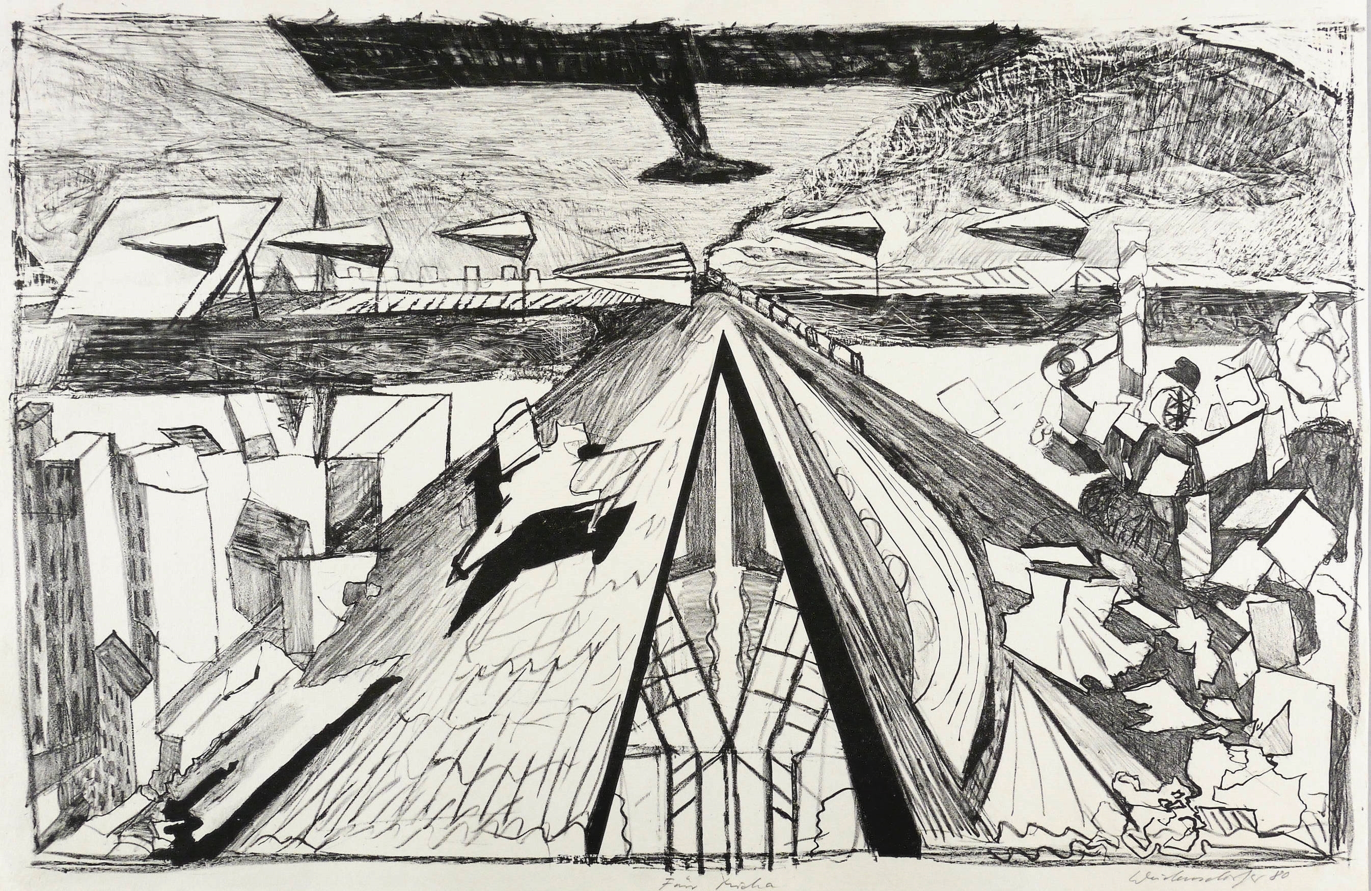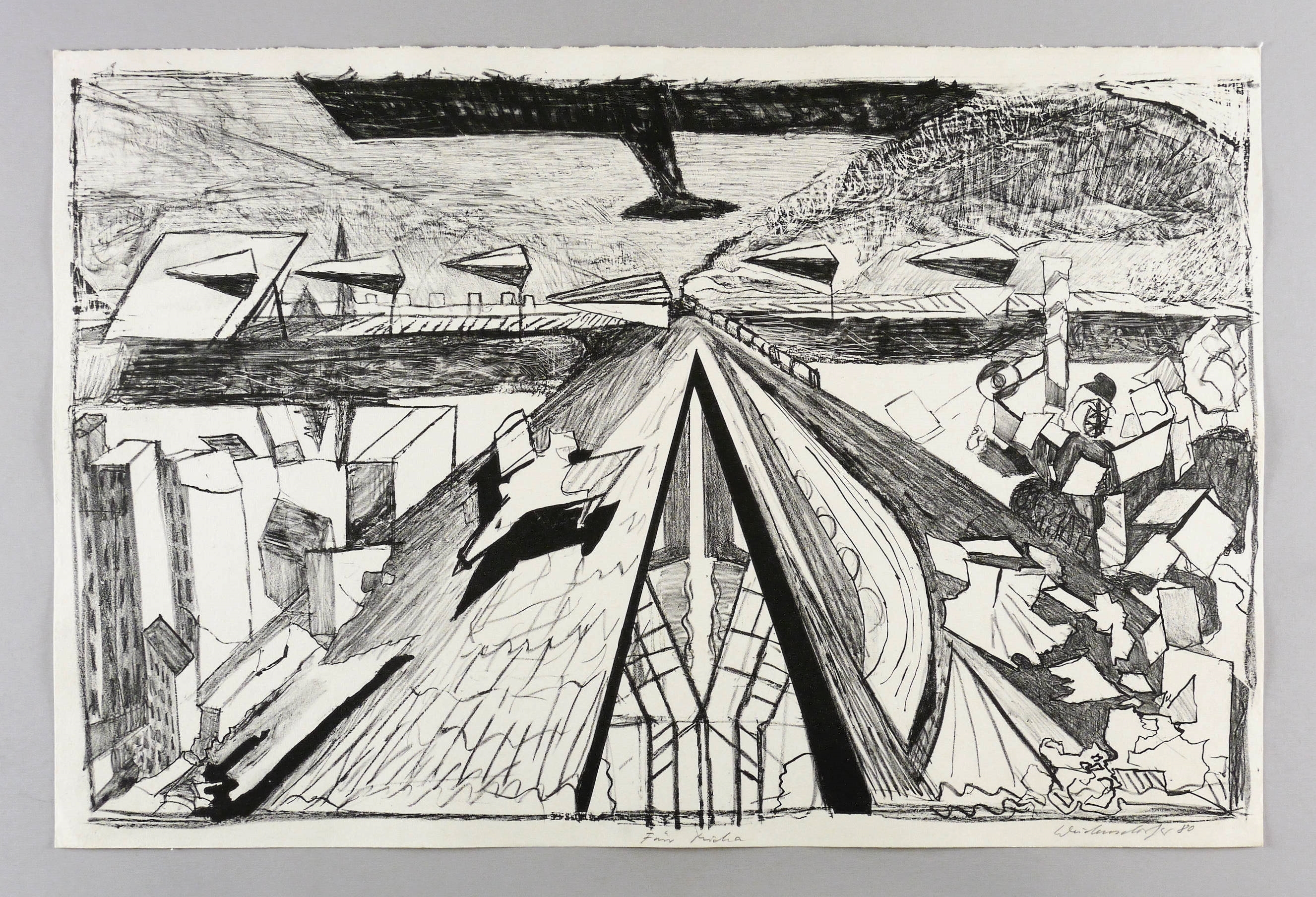 Muschter 280. – Rechts unten in Bleistift signiert und datiert: ″Claus Weidensdorfer 80″. Mittig Widmung. – Zentrales Werk im druckgrafischen Œuvre des Künstlers. – Unikater Probedruck. Druck vom Zeichnungsstein so nicht bei Muschter. Das Werkverzeichnis von Gabriele Muschter führt nur einen Zustand der I. Fassungen des Motivs ″Brücken sind keine Startbahnen″ unter dem Jahr 1980 an, keinen mit 1 Farbe wie hier (vgl. WVZ Muschter Nr. 282). – Provenienz: Michael Wackwitz, Steindrucker in Dresden und Stuttgart. – Ausstellung: 2015 Galerie Döbele, Dresden. – Sehr guter Zustand.