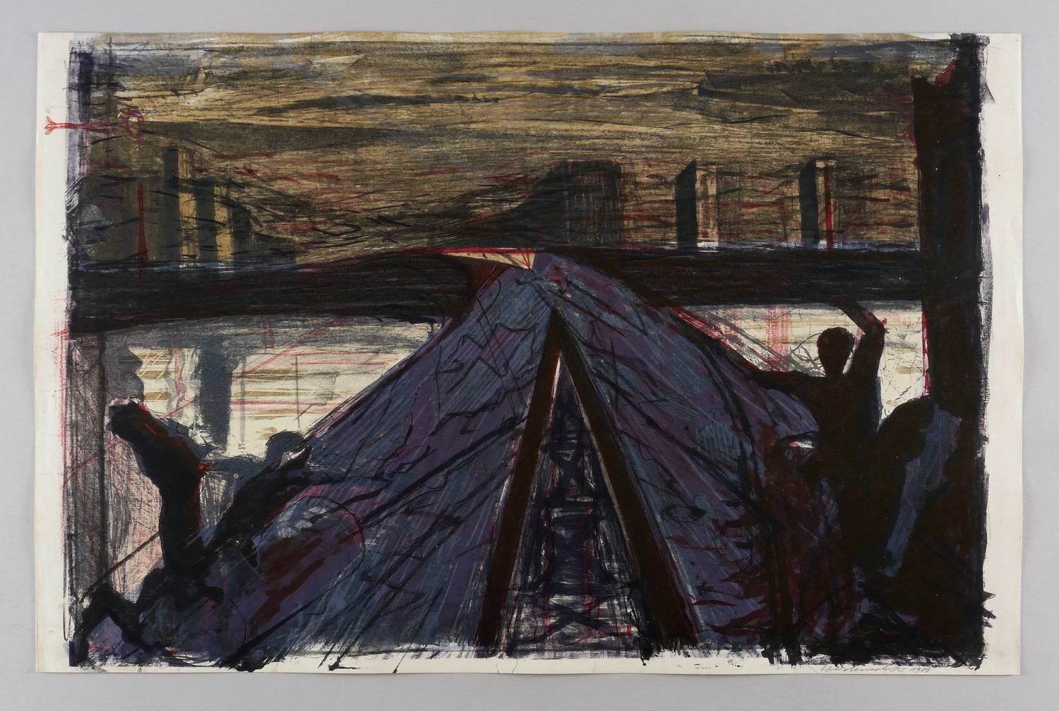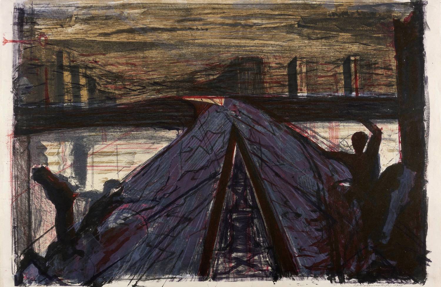 1980. Farblithografie / Kreide-, Feder- & Pinsellithografie, in 6 Farben, auf hellchamois Velin. – Originale Künstlergrafik, von Claus Weidensdorfer. – Druckerexemplar. – 49,7 x 73,9 cm (Darstellung / Druckbild), 50 x 77 cm (Blatt).