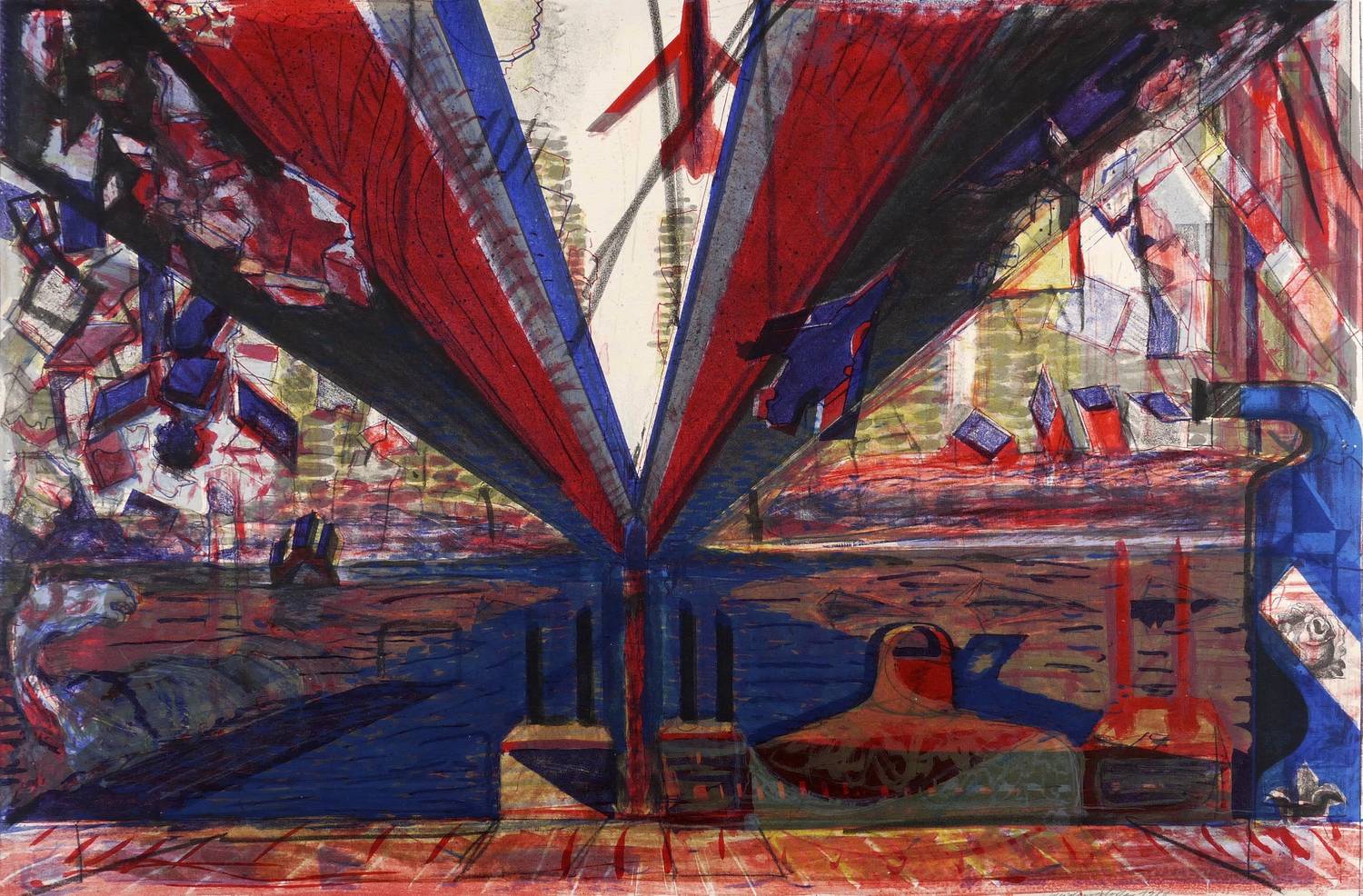 Muschter 283. – Rechts unten in Bleistift signiert und datiert: ″Weidensdorfer 80″. – Zentrales Werk im druckgrafischen Œuvre des Künstlers. – Unikater Probedruck. Unter Verwendung und Übereinanderdrucken der Steine von ″Brücke mit stürzenden Figuren″, ″Brücken sind keine Startbahnen I″ und ″Brücken sind kein Startbahnen II″ (WVZ Muschter Nr. 278, 280, 281). – Provenienz: Michael Wackwitz, Steindrucker in Dresden und Stuttgart. – Sehr guter Zustand.