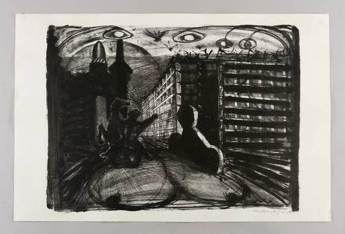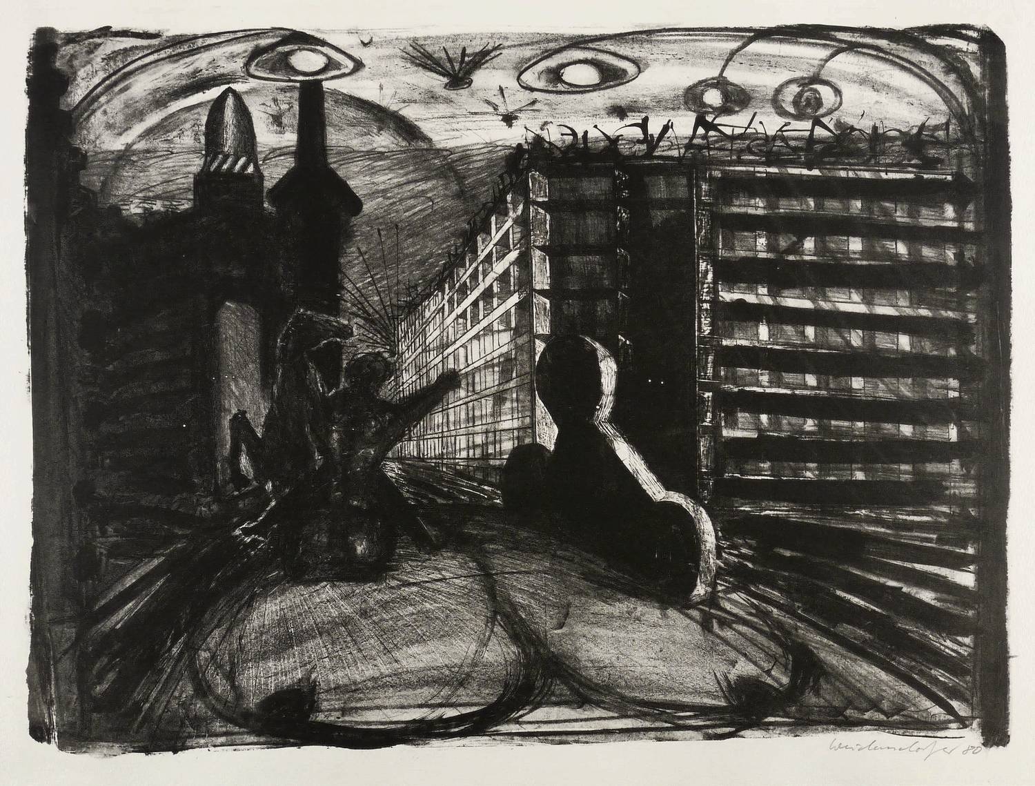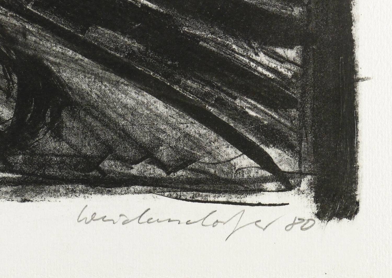 1980. Lithografie / Kreide- & Pinsellithografie, partiell geschabt, in Schwarz, auf hellchamois Hahnemühle. – Originale Künstlergrafik, von Claus Weidensdorfer. – Zustandsdruck. – 45,5 x 60,5 cm (Darstellung / Druckbild), 50 x 76 cm (Blatt).
