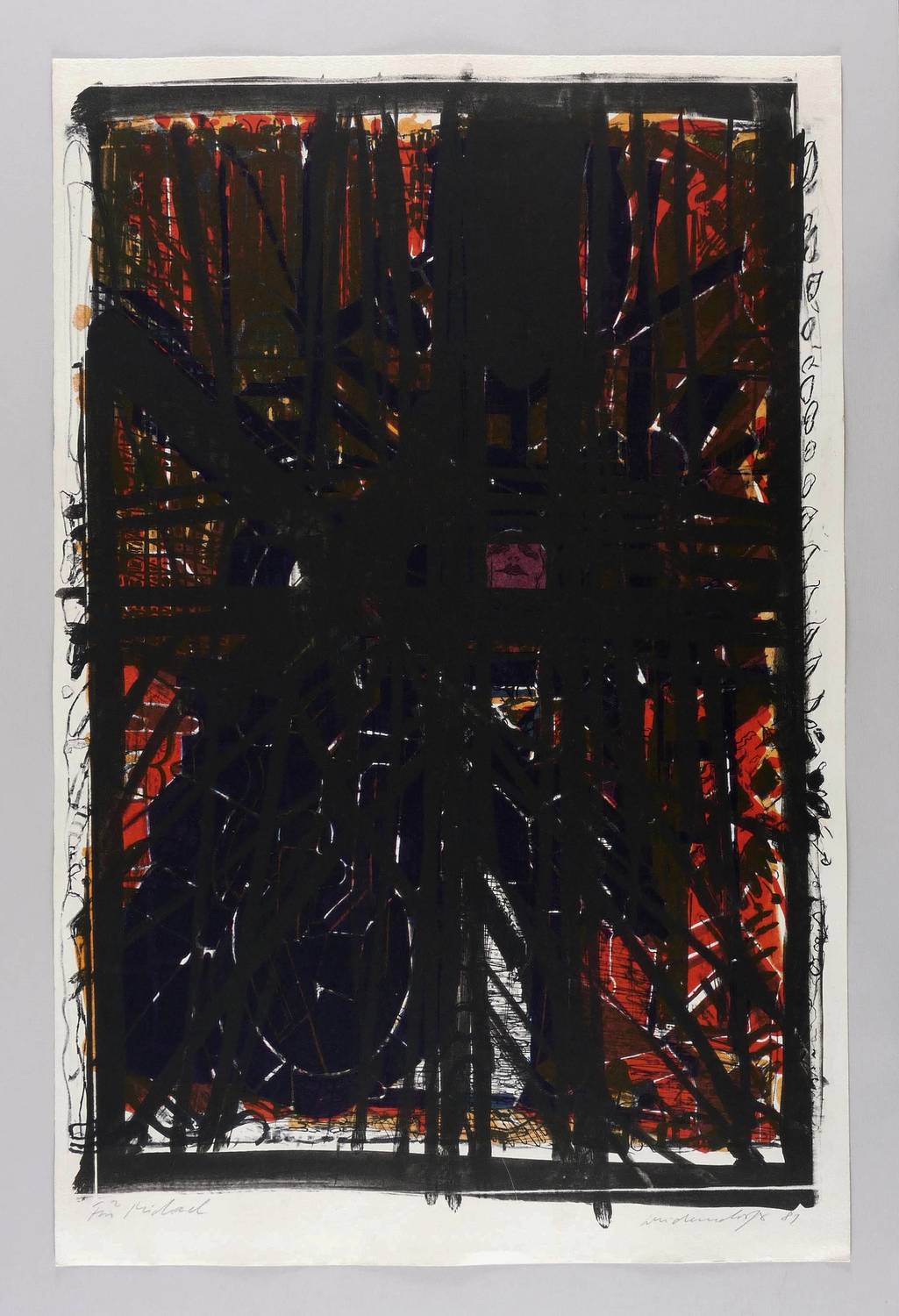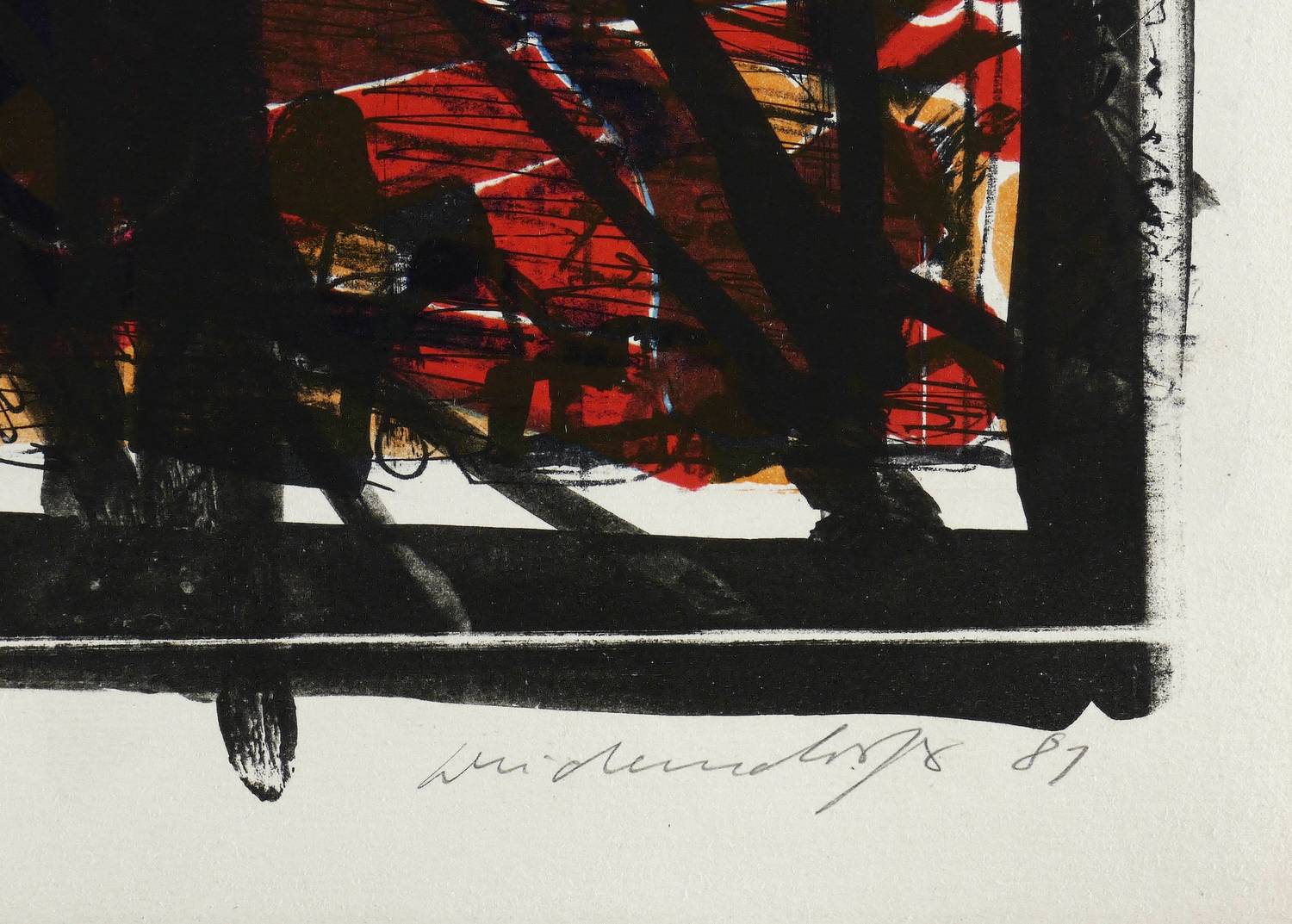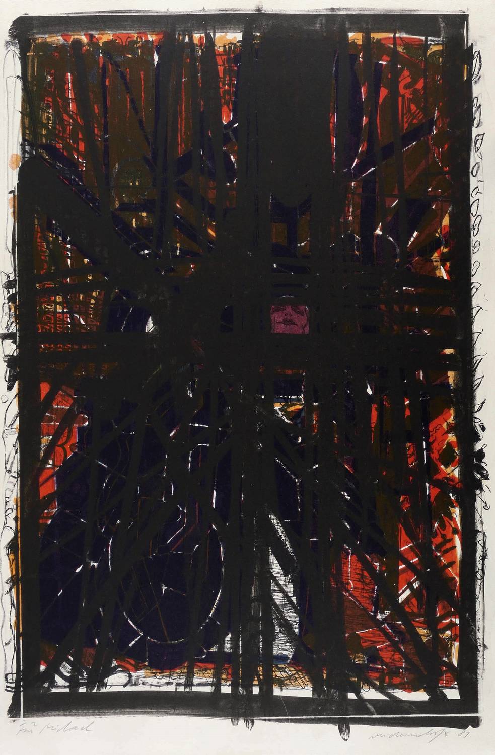 1981. Farblithografie / Kreide- & Pinsellithografie, in 5 Farben, auf hartem hellchamois Weißenborn. – Originale Künstlergrafik, von Claus Weidensdorfer. – Druckerexemplar. – 76 x 51 cm (Blatt), 74,0 x 49,5 cm (Darstellung / Druckbild).
