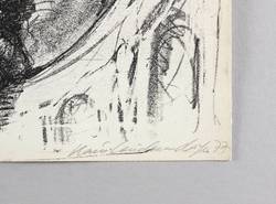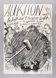 Muschter 247. – In Bleistift rechts unten signiert und datiert: ″Claus Weidensdorfer 77″. Mittig Widmung. Diverse Inschriften. – Originalgrafisches Künstlerplakat zur Auktion der 1. Dresdner Grafikwerkstatt. Erschienen in einer Auflage von 50 Exemplaren. – Provenienz: Michael Wackwitz, Steindrucker Dresden/Stuttgart. – Sehr guter Zustand.