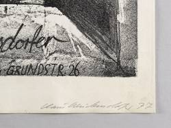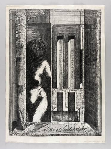 Muschter 246. – In Bleistift rechts unten signiert und datiert: ″Claus Weidensdorfer 77″. Links bezeichnet: ″Probedruck″. Diverse Inschriften. – Originalgrafisches Künstlerplakat zur Ausstellung ″C.W.″ im Leonhardi-Museum in Dresden 21.8.-25.9.1977. – Rückseitig weiterer Druck des Plakatmotivs in einer wesentlich helleren Druckhaltung. – Provenienz: Michael Wackwitz, Steindrucker Dresden und Stuttgart. – Guter Zustand.